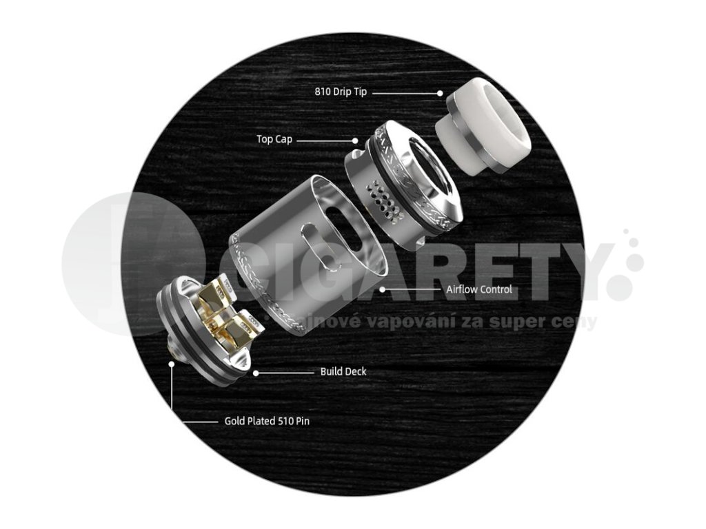 Na top capu atomizéru se nachází regulační airflow kroužek. Ten najdete v boční části. Plynulým otáčením tohoto kroužku můžete využít jak dva protilehlé širší otvory, tak také dva otvory tvořené řadou menších otvorů. Sami si tak zvolíte, jaká tvorba páry vám bude nejlépe vyhovovat a potah si přizpůsobíte přesně svým představám.