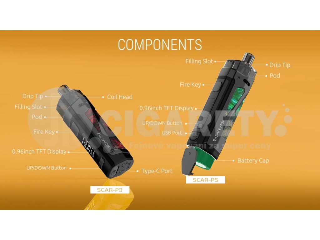 Pod Cartridge sloužící jako zásobník pro Vaší oblíbenou náplň (e-liquid), která v tomto případě slouží zároveň i jako náustek a nosič samotné žhavící hlavy. V případě elektronické cigarety Smok Scar-P5 a P3 se jedná hned o dvě takové Cartridge, o celkovém objemu 5ml, kdy každá je určena pro jiný styl vapování a jinou žhavící hlavu. V jednom případě se jedná o žhavící hlavu s označením RPM Mesh s odporem 0,4Ω, která je vhodná pro MTL styl vapování (jako u klasické cigarety), při doporučeném výkonu 25W, a u druhé se jedná o žhavící hlavu s označením RPM 2, rovněž s mesh spirálkou a celkovým odporem 0,16Ω, která se díky svému nízkému odporu velmi hodí pro DL styl potahování (přímým potahováním do plic). Doporučený výkon pro tuto žhavící hlavu je mezi 25-50W, avšak nejlepšího podání chuti dosahnete při výkonu 40W. Instalace cartridge a žhavící hlavy probíhá pouhým zasunutím, a je tak velmi jednoduchá a zvládne jí bez problémů každý.