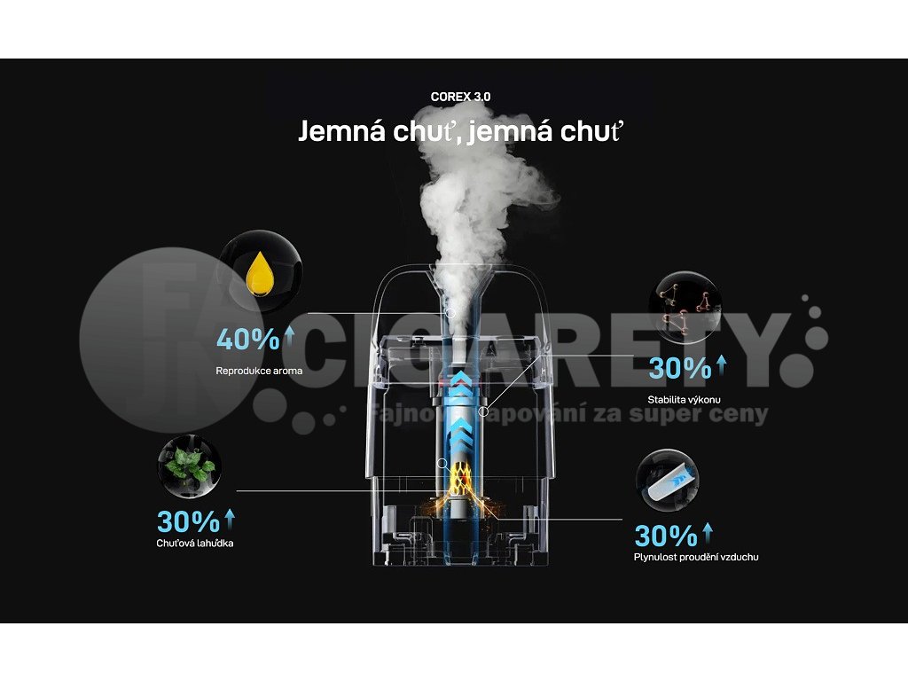 Technologie COREX 3.0COREX 3.0 je nejnovější generace ohřívací technologie od Vaporesso, která staví na předchozích verzích s výrazným vylepšením. Využívá strukturu Hive-Mesh s jemnějším topným tělesem pro rovnoměrnější vedení tepla a stabilnější teplotu atomizace. Materiál topného tělesa byl změněn z nikl-chromu na železo-chrom-hliník, což zvyšuje topnou plochu o 25%. |
