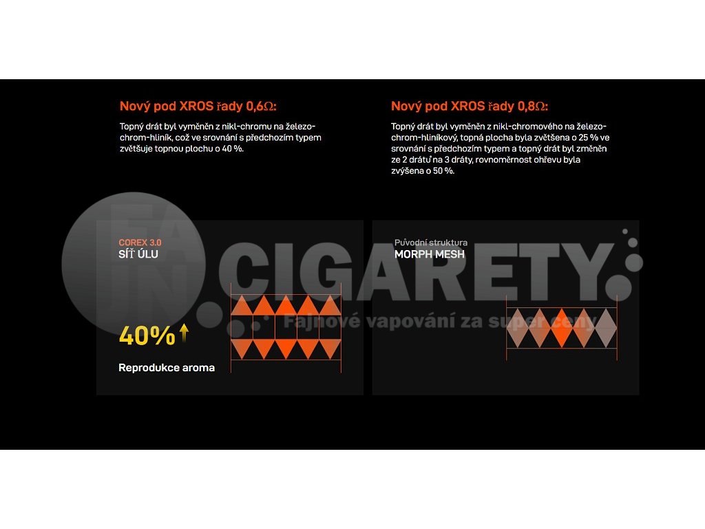 Technologie COREX 3.0COREX 3.0 je nejnovější generace ohřívací technologie od Vaporesso, která staví na předchozích verzích s výrazným vylepšením. Využívá strukturu Hive-Mesh s jemnějším topným tělesem pro rovnoměrnější vedení tepla a stabilnější teplotu atomizace. Materiál topného tělesa byl změněn z nikl-chromu na železo-chrom-hliník, což zvyšuje topnou plochu a zlepšuje reprodukci chuti. |