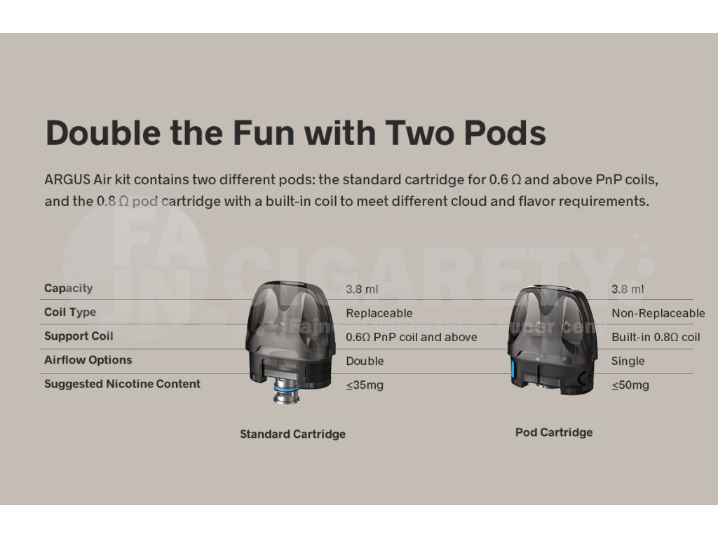 Náhradní Pod Cartridge pro elektronickou cigaretu VooPoo Argus Air Pod Kit o objemu 3,8 ml s integrovanou fixní žhavící hlavou s odporem 0,8ohm. Cartridge je primárně určena pro MTL vapování. Je kompatibilní pouze s modelem elektronické cigarety VooPoo Argus Air Pod Kit.