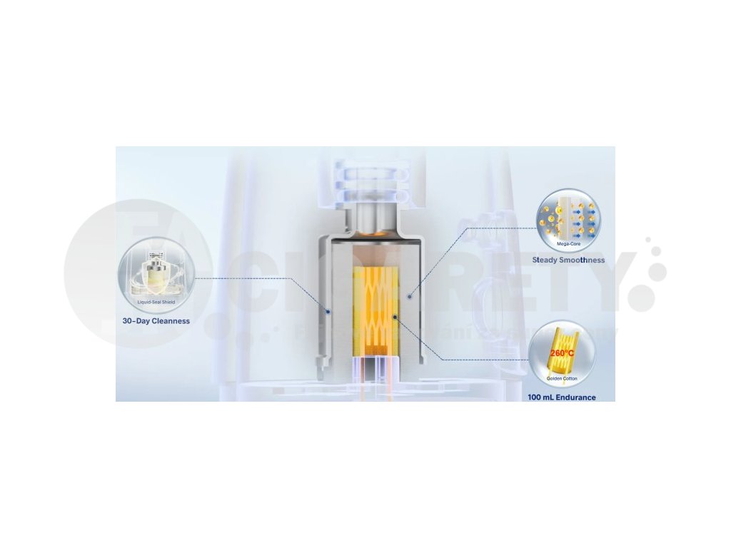 ARGUS Top Fill V2, která využívá nejnovější technologii iCOSM 2.0. Tato inovace přináší tři klíčové výhody: 30denní čistotu, stabilní a hladký projev a výdrž až 100 ml e-liquidu. Naše vlastní měděná komora vytváří e-liquidový film, který pokrývá 99 % vaty a udržuje stálý tlak vzduchu. Tento film je 3× hustší než u běžných konstrukcí, což zvyšuje odolnost proti protékání o 83 % a zajišťuje bezproblémový provoz i v náročných podmínkách. Bez protékání. Bez nepořádku. Čisté potěšení. Kompatibilní s celou řadou zařízení ARGUS.