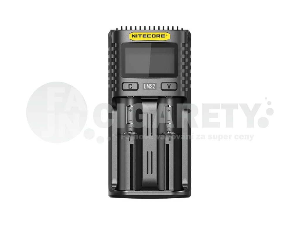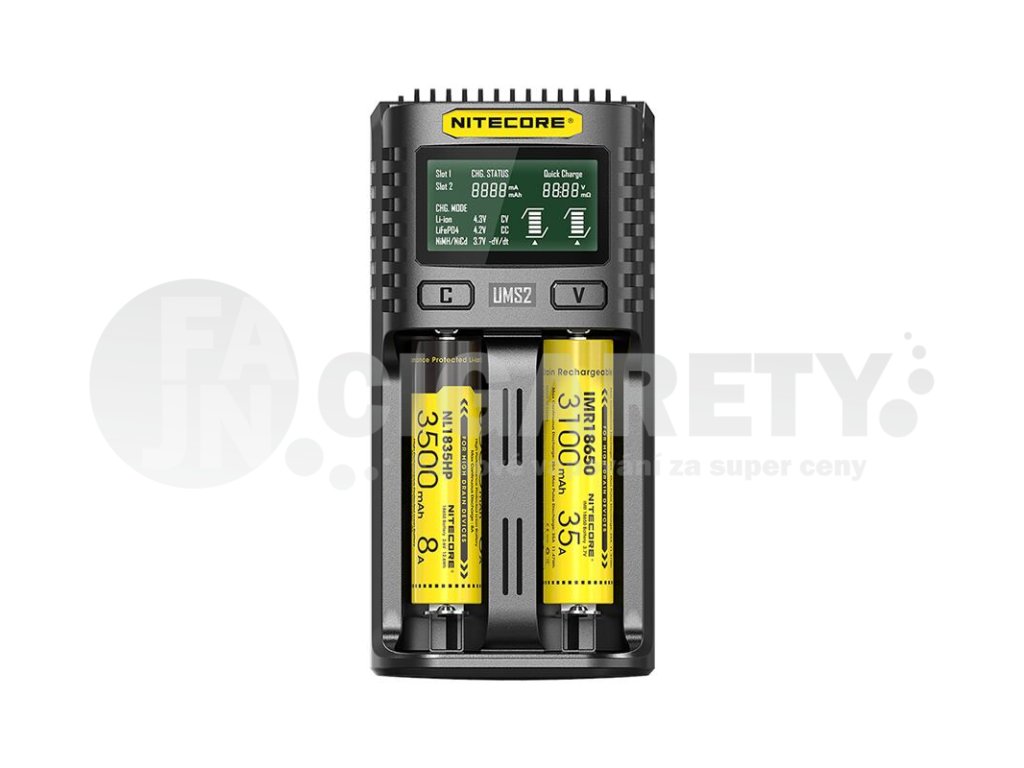 Nabíječka Nitecore UMS2 LCD je multifunkční a extrémně výkonná USB nabíječka společnosti Nitecore, která je inovována pro nabíjení baterií IMR, je také kompatibilní s bateriemi Li-on, Ni-MH, Ni-Cd s LiFeP04. Má v sobě zabudovaný velký a přehledný displej, na kterém je možné sledovat stav nabití baterie, zvolený režim, typ baterie nebo napětí. Tato inteligentní nabíječka si sama hlídá stav nabití baterií a jakmile dojde k nabití, ihned nabíjení zastaví. Novinkou je potom přítomnost podpory QC rychlého dobíjení článků. Výstupní proud tak dosahuje až 2000 mA na jeden slot při dobíjení dvou baterií souběžně. V nabíječce je možné dobíjet až 2 baterie současně, všechny se nabíjí nezávisle na sobě. Samozřejmě není ani problém nabíjet pouze jeden článek.