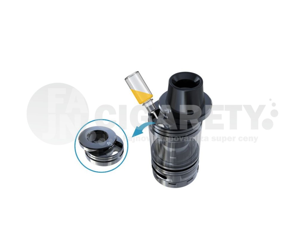 V balení najdete dvě žhavící hlavy CA-M2 s odporem 0,3 ohm. Obě zajistí velkou produkci páry a vynikající chuť e-liquidu. Ve vrchní části tanku najdete široký delrinový náustek a hlavně možnost pohodlného vrchního plnění e-liquidu. Stačí vysunout vrchní uzávěr lehce do strany a do pootevřeného otvoru doplnit e-liquid podle potřeby.