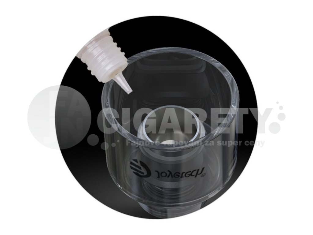 Novinkou je systém plnění e-liquidu. Jelikož se jedná o clearomizér, jehož vrchní část se skládá pouze z jednoho dílu, je zapotřebí plnit e-liquid spodem. Odšroubujte spodní základnu, otočte celé skleněné tělo vzhůru nohama a naplňte ho e-liquidem. Poté jen zašroubujte zpět základnu a žhavící hlavu a můžete začít vapovat. Do tanku lze doplnit e-liquid až do kapacity 2 ml. Ve spojení s touto příjemnou kapacitou tanku a stylovým designem se jedná o jeden z nejkrásnějších atomizérů na trhu.