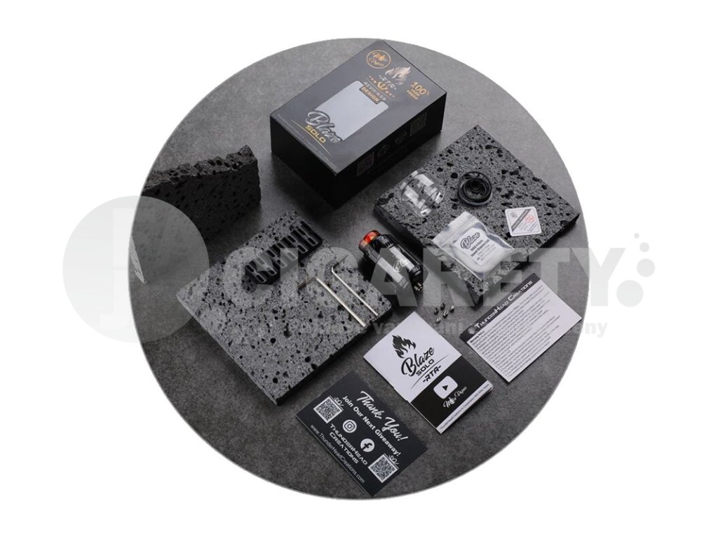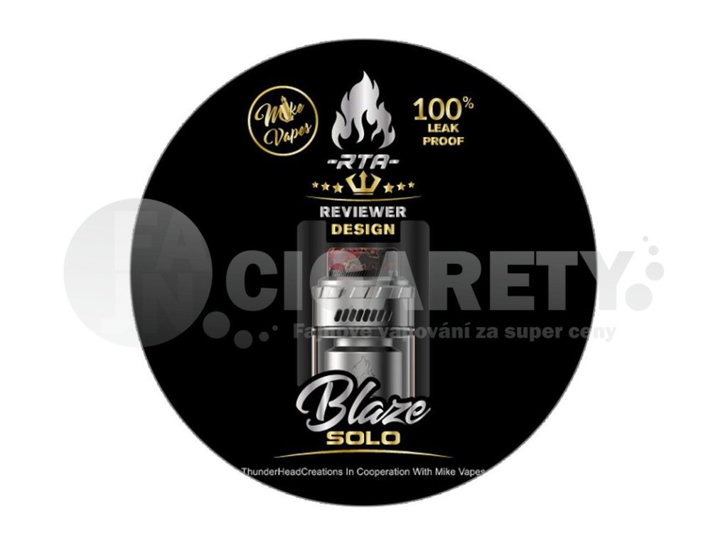 Světoznámý výrobce DIY zařízení pro vaping opět spojil síly s recenzentem Mike Vapes a uvádí na trh sólovou variantu populárního motacího atomizéru Blaze. Model THC Blaze Solo RTA nabídne obrovský objem tanku, praktickou bezsloupkovou základnu, horní systém regulace airflow a přímý ofuk instalované spirálky díky speciálnímu systému cirkulace vzduchu. Kovové tělo atomizéru nabídne také sympatické rozměry a širokou kompatibilitu díky závitu typu 510 ve spodní části. Celkový objem clearomizéru s použitím standardního skla činí 3,5 ml. Tuto kapacitu je možné rychlým krokem navýšit až na 5,5 ml. Postačí jen tělo osadit pyrexovým bubble sklem. Pro snadné plnění je k dispozici bajonetový systém horního doplňování. Celý proces naplnění tak zvládnete během pár vteřin.