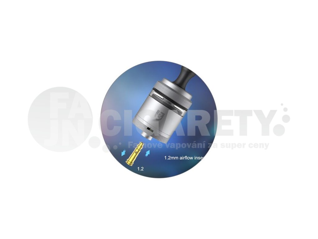 Přísun vzduchu do atomizéru je řešen spodními přívodními otvory, výslednou tuhost si poté budete moci přizpůsobit díky speciálním vzduchovým vložkám, které se instalují přímo do závitu 510. Výchozí centrpin disponuje vložkou s průměrem 1,2 mm, v balení na vás potom čekají náhradní vložky s průměry vzduchového otvoru 0,8 mm, 1,4 mm a 2,0 mm. Díky této široké variabilitě si můžete výslednou tuhost doladit k naprosté dokonalosti.