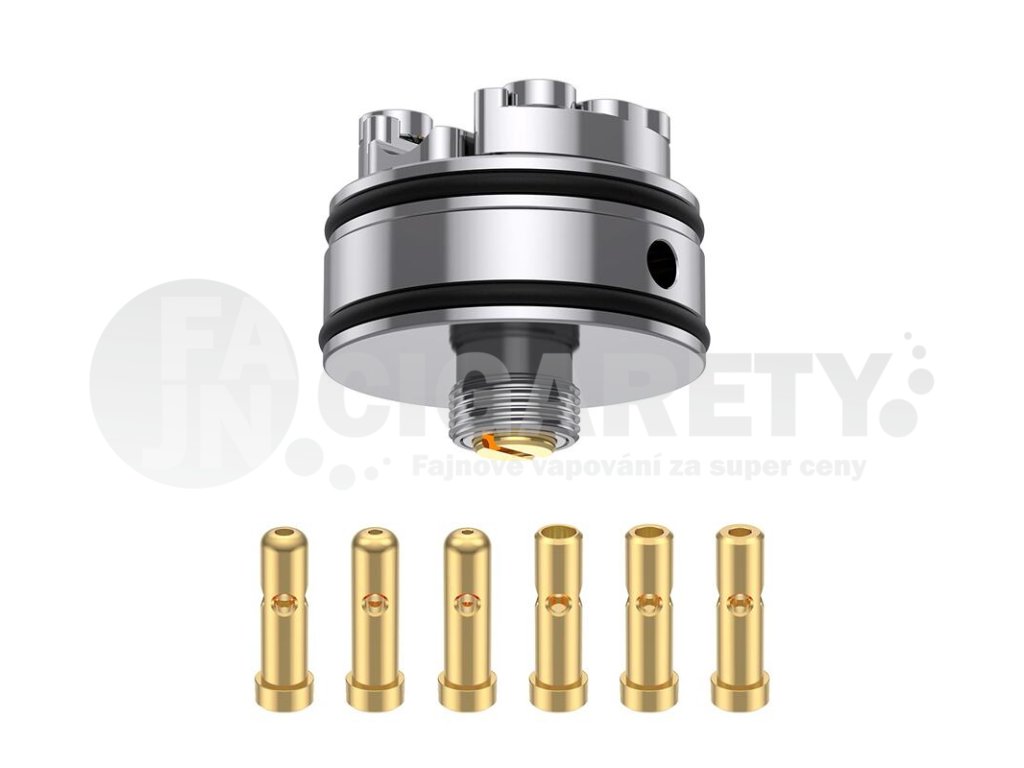 V jádru clearomizéru Alberich MTL RTA na vás čeká stylová základna se dvěma protilehlými sloupky, která umožňuje hladkou instalaci jedné spirálky dle vlastního výběru. Kontakty pro usazení spirálky nabídnou dostatek prostoru a montáž je proto nesmírně snadná a sama o sobě také jednoduchá pro začátečníky. O co nejlepší požitek z MTL potahu se postará pečlivě navržený systém airflow. Ve spodní části najdete kroužek pro regulaci přísunu vzduchu a samotnou tuhost potahu budete moci ještě vylepšit díky praktickým vzduchovým vložkám, které se instalují přímo do závitu ve spodní části. V základním balení na vás čekají vložky s průměry vzduchového otvoru 0,8 mm, 1,0 mm, 1,3 mm, 1,6 mm, 2,0 mm a 2,5 mm. Optimální přenos páry do úst obstará úzký podlouhlý náustek s uchycením typu 510 ve vrchní části. Vapefly Alberich MTL RTA je špičkový motací atomizér pro klasické šlukování, od kterého se jen tak neodtrhnete.