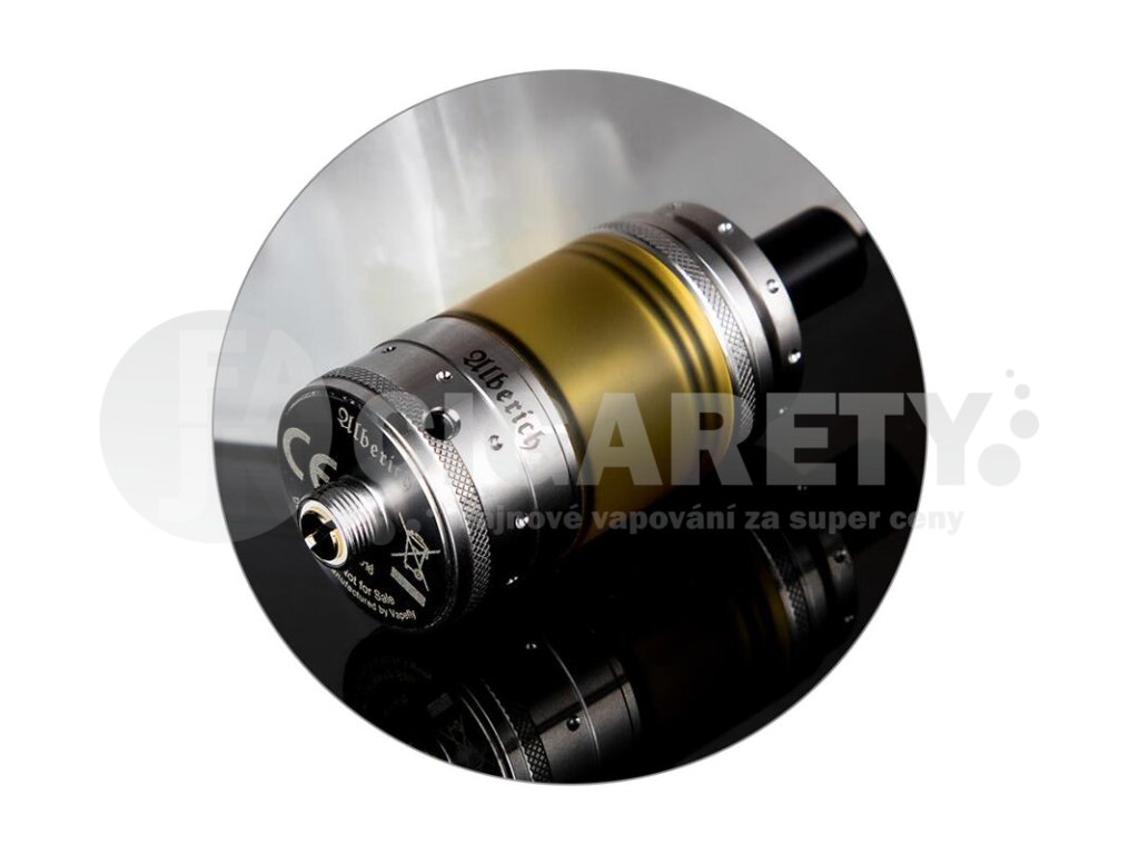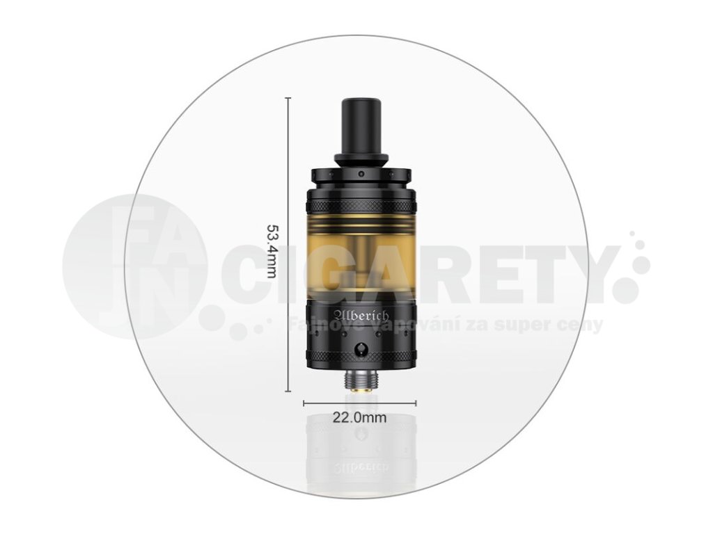 Vapefly Alberich MTL RTA je kvalitně zpracovaný atomizér s nádherným designem a stylovým kovovým tělem. Na pohled působí robustním, přesto však také elegantním dojmem. Jeho délka činí 53,4 mm a průměr se zastavil na 22 mm. Díky těmto rozměrům si bude rozumět s drtivou většinou modů na současném trhu. Samozřejmostí je potom závit typu 510 ve spodní části.