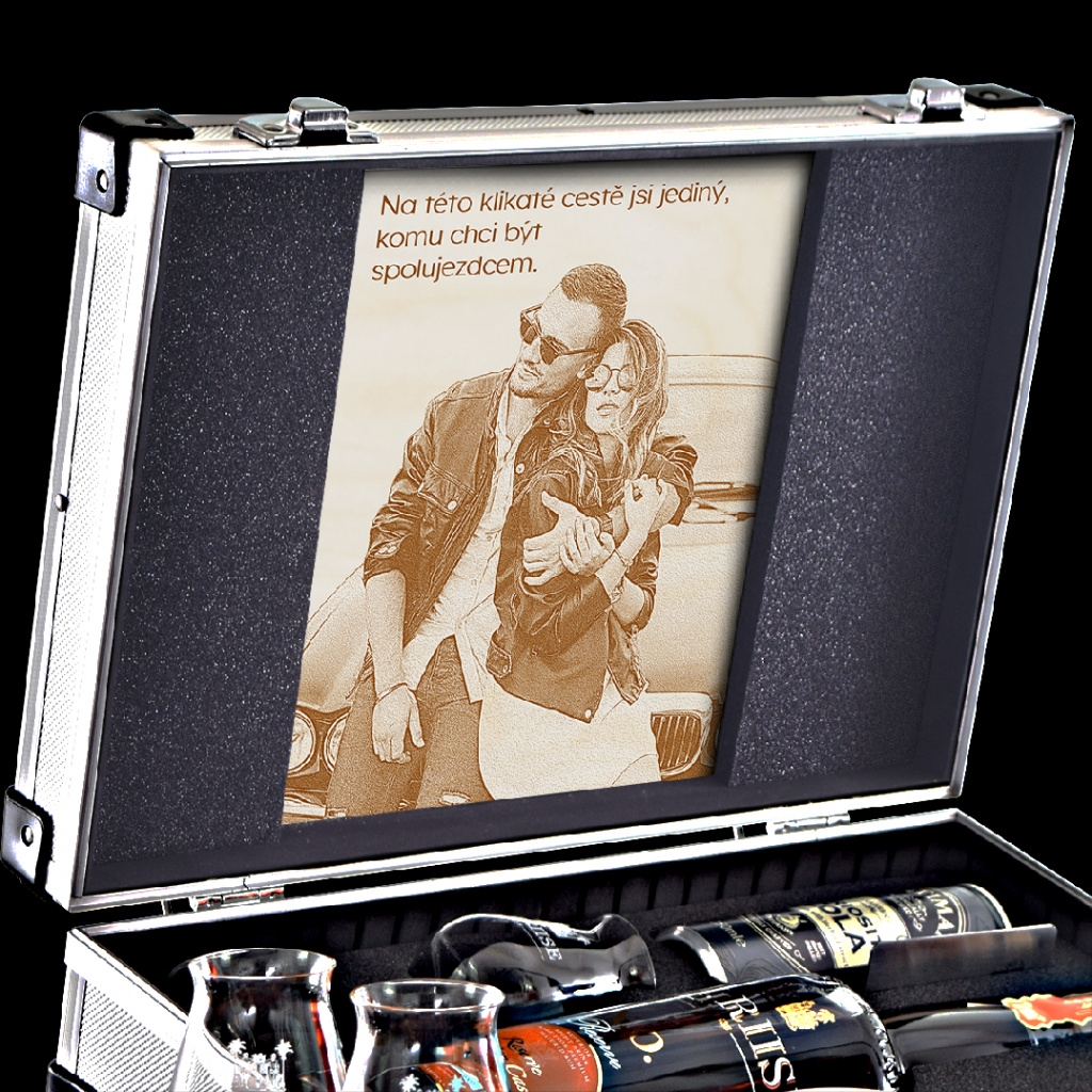 Vaše nápady rádi umístíme do víka dárkového kufru. Překvapit můžete gravírováním na stylové plexi, nebo dřevěné desce, nebo oblíbenou fotografií doplněnou jedinečným přáním.