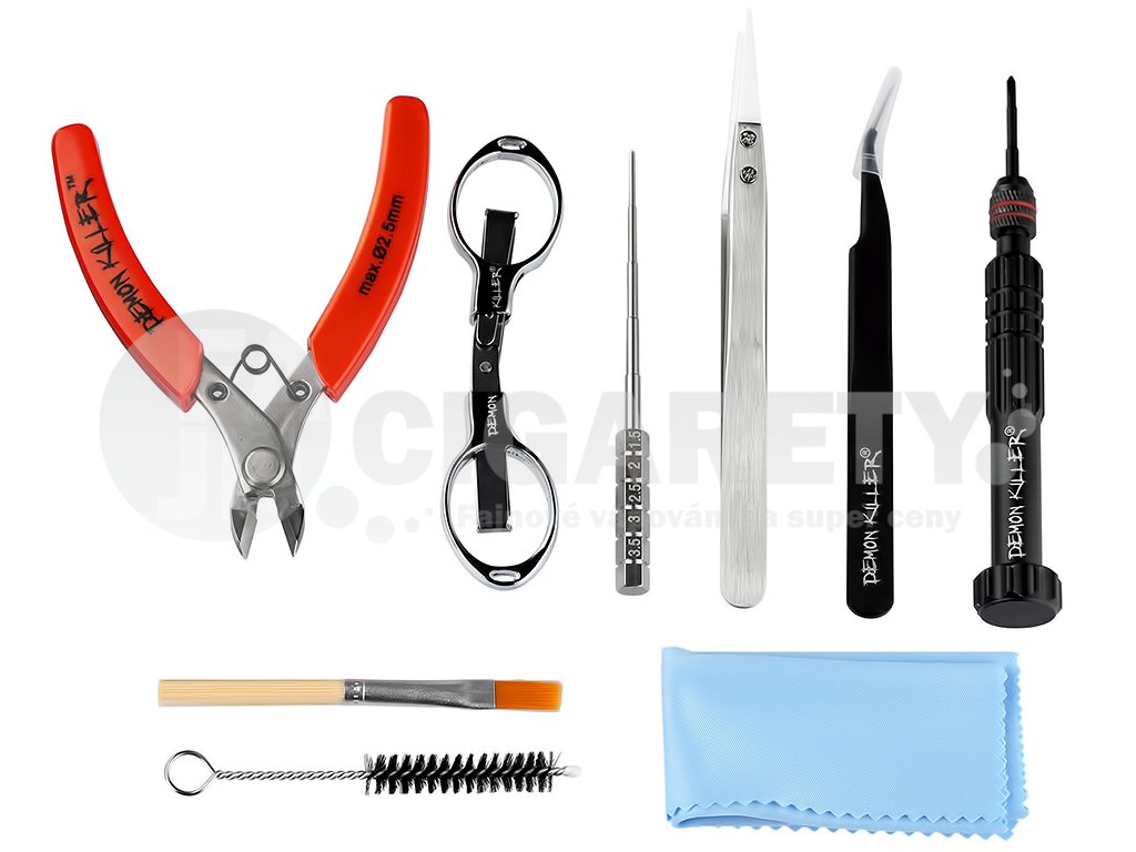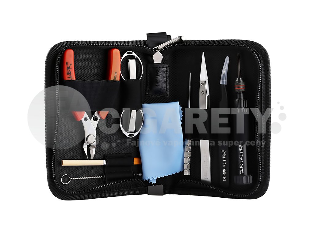 Už není potřeba používat různé velké sady nástrojů. Demon Killer SET nabízí tento malý, ale velmi praktický set, se kterým se výroba, a následně samotná instalace vlastnoručně vyrobených spirálek stane rutinou. K výrobě vlastní spirály například někde na cestách Vám postačí už jen přibalit odporový drát, absorbční vatu a případně svou RBA hlavu, a můžete vyrazit v podstatě kamkoliv. Vše potřebné k tomuto úkonu totiž naleznete právě v tomto setu. Od kleští na štípání odporového drátu, přes pinzety s různými konstrukčními vlastnostmi, nůžkami na stříhání vaty, až po samotnou namotávačku vlastních spirál. SET nářadí Demon Killer totiž obsahuje vše potřebné.
