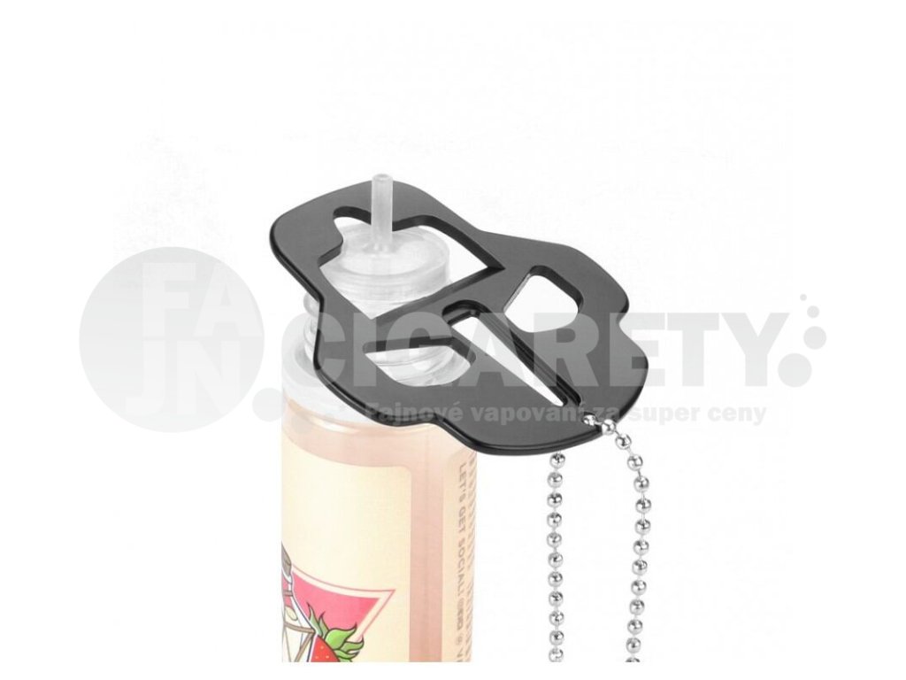 Nástroj 5v1 dokáže otevřít všechny běžně dostupné lahvičky o objemu 10ml, 30ml, 50ml, 60ml a 120ml. Součástí balení je praktický řetízek pro zavěšení na krk.
