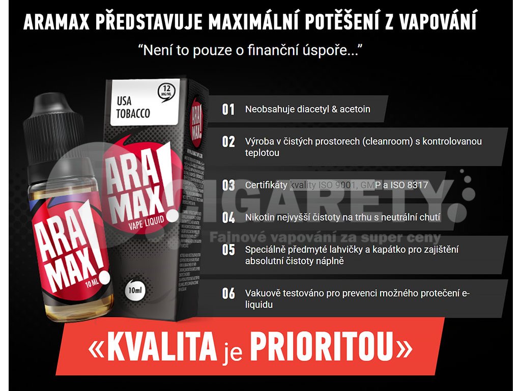 Značka Aramax patří mezi významné výrobce e-cigaret a vynikajících příchutí. Aramax má také vlastní elektronické cigarety. Aramax cigarety jsou vyráběny pro snadné každodenní použití za přijatelné ceny. Aramax přináší kvalitu, jednoduchost a eleganci pro každý den. Aramax má rozmanitou nabídku příchutí. Aramax má čistou a věrnou chuť. Aramax má také vysoce kvalitní výrobu.