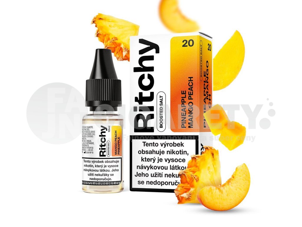 Ritchy Salt Pineapple Mango Peach (Ananas, mango a broskev) 10ml intenzita nikotinu 10mg tabáková nálepka Kolek Q