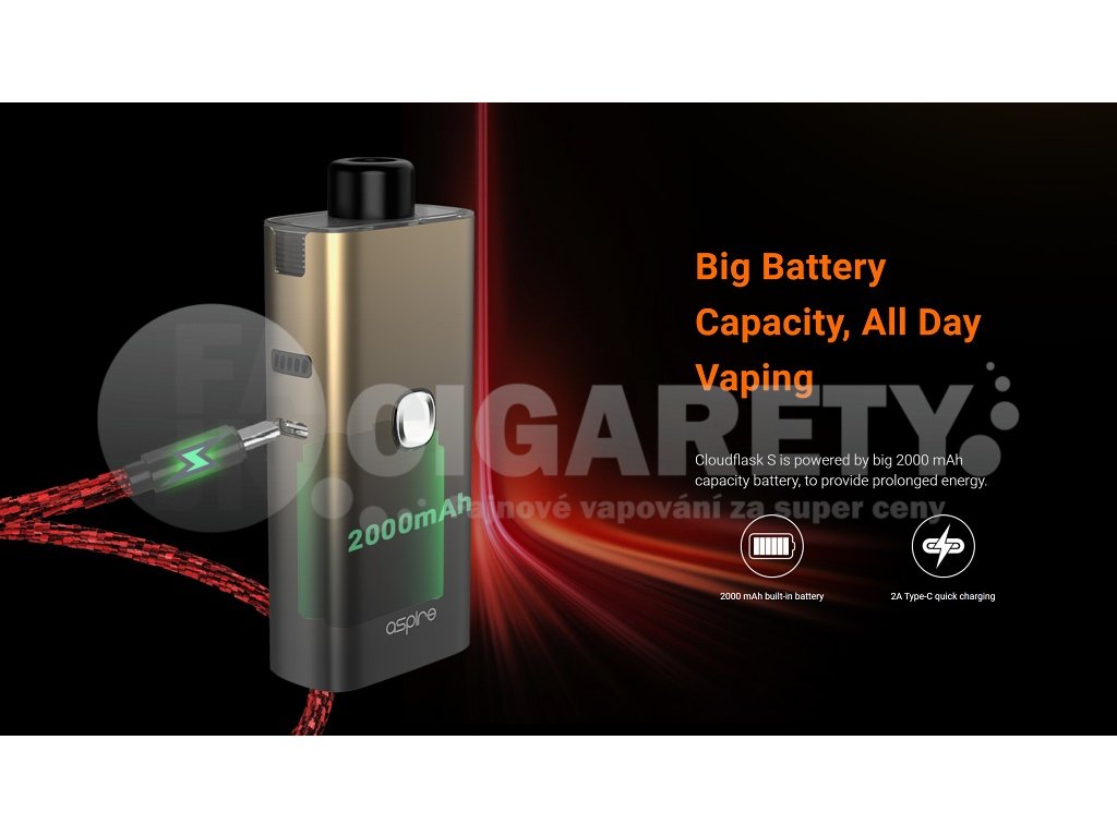 Cloudflask S je vylepšením revolučního sub-ohmového pod systému Aspire Cloudflask. Jednoduchý a snadno použitelný pod systém s vyměnitelnými žhavícími hlavami, který je navržen tak, aby produkoval ještě více páry. Cloudflask S disponuje integrovanou interní baterií s kapacitou 2000 mAh. Tato vysoká kapacita zaručuje bezproblémové celodenní vapování. Objem Pod cartridge 2ml, rychlé USB-C nabíjení, LED indikace stavu nabití. Bezpečnostní ochrana čipové sady Aspire ASP, 2x žhavící hlava v SETU. Tato cigareta je vhodná pro DL vapování.
