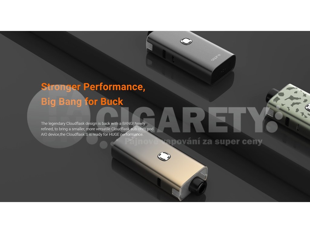 Cloudflask S je vylepšením revolučního sub-ohmového pod systému Aspire Cloudflask. Jednoduchý a snadno použitelný pod systém s vyměnitelnými žhavícími hlavami, který je navržen tak, aby produkoval ještě více páry. Cloudflask S disponuje integrovanou interní baterií s kapacitou 2000 mAh. Tato vysoká kapacita zaručuje bezproblémové celodenní vapování. Objem Pod cartridge 2ml, rychlé USB-C nabíjení, LED indikace stavu nabití. Bezpečnostní ochrana čipové sady Aspire ASP, 2x žhavící hlava v SETU. Tato cigareta je vhodná pro DL vapování.