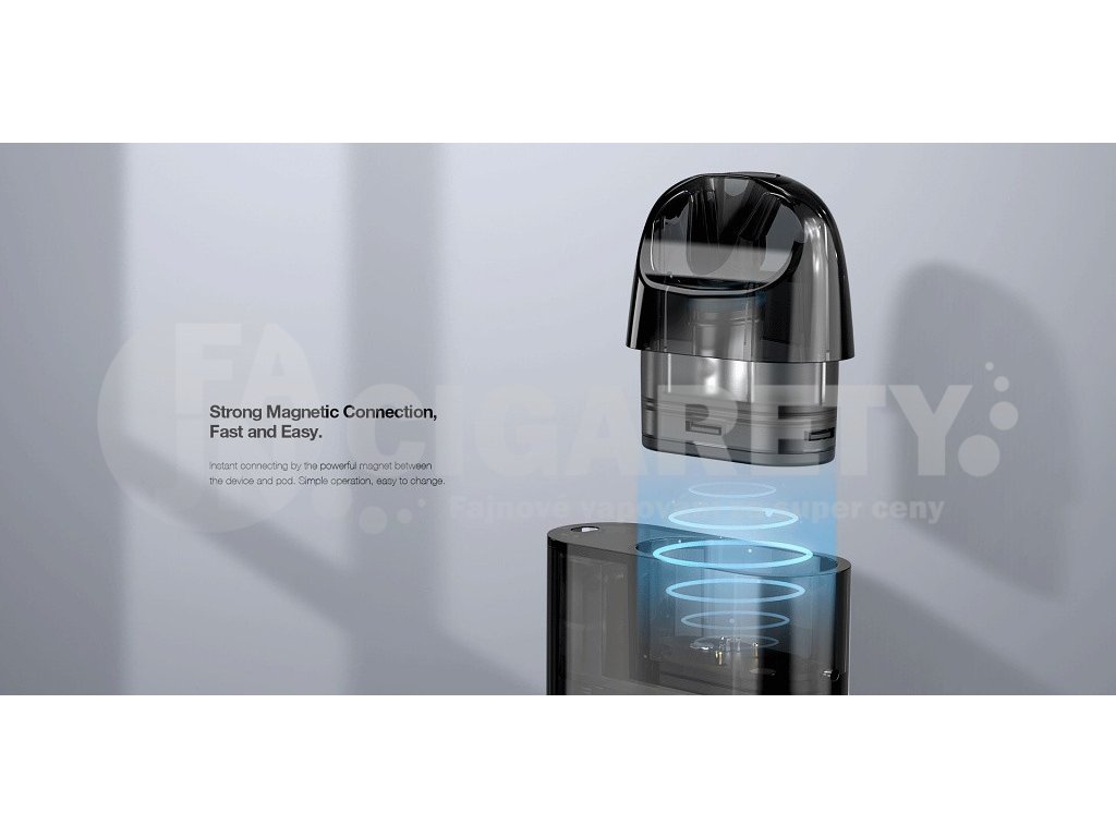Malá a lehká Pod elektronická cigareta s integrovanou baterií o kapacitě 850mAh, automatická aktivace potahu, rychlé USB-C nabíjení, lehce vyměnitelná a plnitelná Pod cartridge o objemu 3ml s integrovanou žhavící hlavou s odporem 0,8ohm. Rozměry: 75mm x 40mm x 15,8mm.