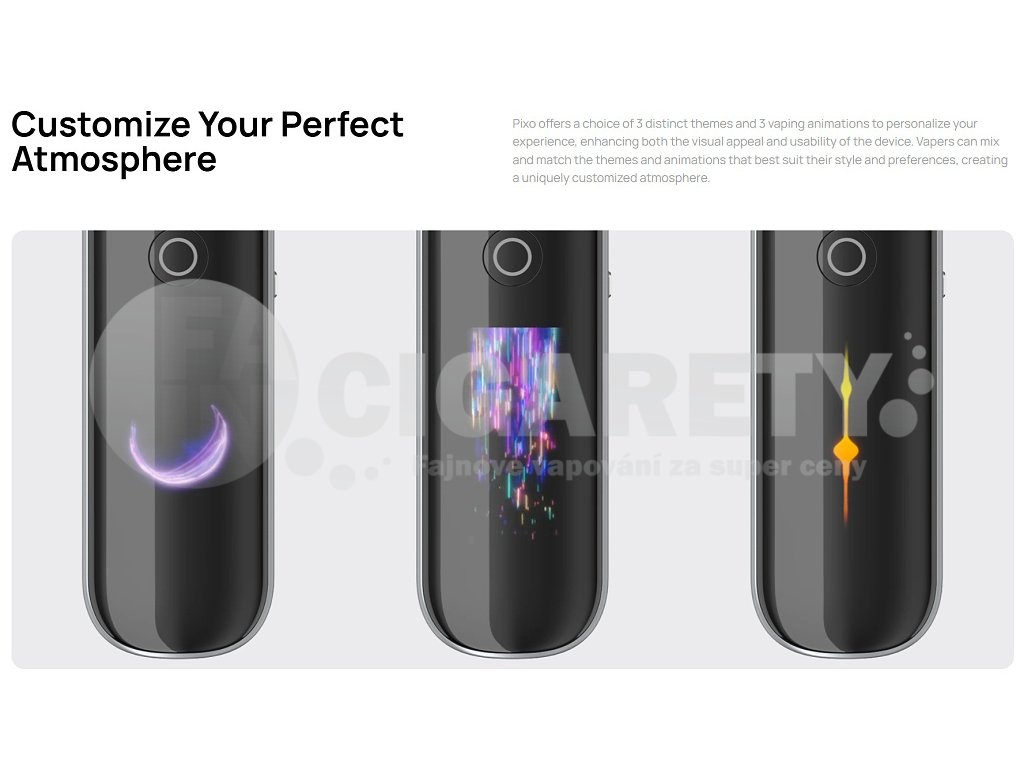 Aspire Pixo Pod představuje dokonalou volbu pro všechny uživatele, kteří hledají kombinaci moderních technologií, praktičnosti a výjimečného výkonu v kompaktním balení. Zařízení je navrženo s důrazem na jednoduchost používání díky automatickému potahování a intuitivnímu dotykovému ovládání. Pod Cartridge s objemem 2 ml jsou vybaveny integrovanými žhavícími hlavami s moderním mesh pletivem, které zajišťuje skvělé podání chuti, rychlý náběh žhavení a optimální produkci páry. Na výběr máte z několika atraktivních témat a animací, které se zobrazují během potahu, čímž se vapování stává ještě zábavnějším a personalizovanějším zážitkem. Displej zobrazuje všechny důležité informace včetně výkonu, stavu baterie a počtu potahů. Elektronická cigareta je kompatibilní jak s klasickými E-liquidy, tak s NicSalt náplněmi, což z ní činí univerzální řešení pro širokou škálu uživatelů. Aspire Pixo Pod je ideální pro začátečníky i pokročilé uživatele, kteří oceňují kvalitu, spolehlivost a moderní technologie.