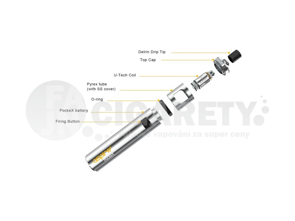 PockeX AIO je jednoduchá a výkonná ALL in ONE elektronická cigareta od společnosti aSpire. Svými vlastnostmi uspokojí jak úplné začátečníky, tak i zkušené uživatele, kteří si chtějí prožít vaping bez jakéhokoli nastavování (výkon je nastavován automaticky v závislosti na zvoleném odporu atomizeru). Vrchní plnění pojme až 2ml liquidu s možností vyjmutí clearomizeru pro snadnou údržbu. Žhavicí hlava se skrývá pod širokým náustkem, který přináší ještě větší množství páry. Nové hlavy PockeX používají technologii U-Tech, tj. dvě vertikální spirálky vedle sebe, kde vzduch prochází postupně oběma spirálkami = velké množství páry a autentická chuť liquidu. Vestavěná baterie disponuje kapacitou 1500mAh. Nabíjení umožňuje micro USB vstup (e-cigaretu lze používat i při nabíjení). Více info v detailním popisu