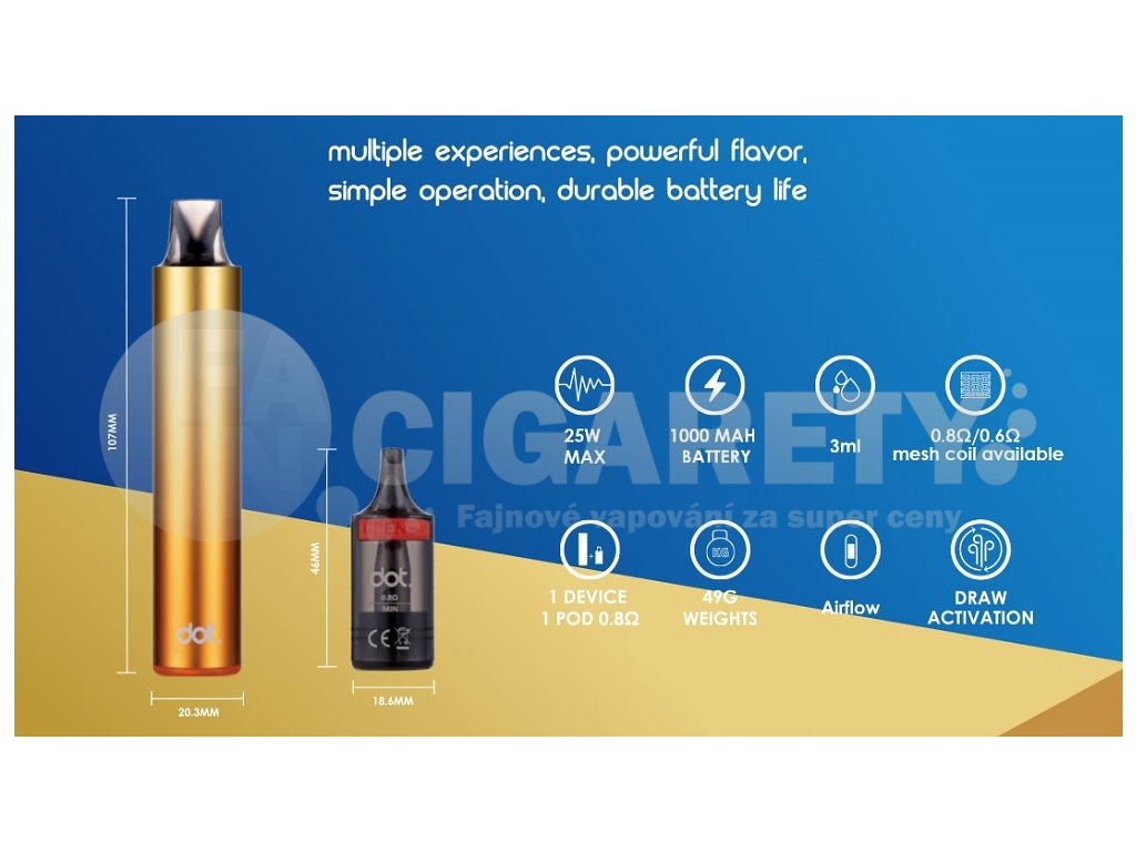 Moderní technologieDotmod Switch R Pod Kit představuje dokonalé spojení elegantního designu s pokročilými vaping technologiemi. Automatický provoz, velká kapacita baterie a prémiové zpracování činí z tohoto modelu ideální volbu pro všechny milovníky MTL vapování. Zařízení nabízí spolehlivý výkon a výjimečnou chuť v kompaktním balení. |