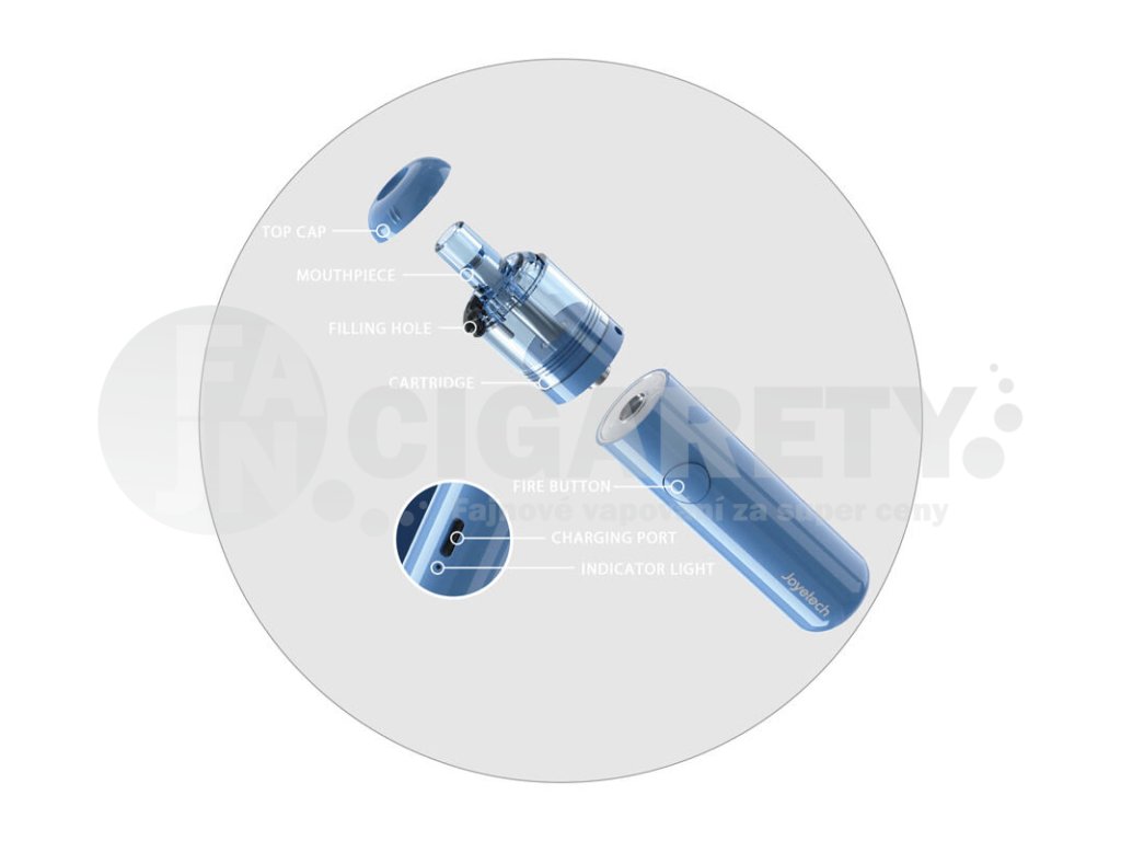 Joyetech eGo 510 Pod Kit je nový přírůstek do rodiny praktických MTL pod systémů eGo Pod, nově však přináší tradiční závit 510 a celou řadu dalších vychytávek, které zaručeně zpříjemní každodenní používání. Tělo zařízení nabídne tradiční dílenské zpracování, jedná se o klasickou trubkovou konstrukci s délkou těla 113 mm a průměrem 22 mm. Tělo je příjemně ergonomické a pohodlně se používá. Samotná e-cigareta se skládá ze dvou základních částí - těla baterie a pod clearomizéru, obě části jsou na sebe našroubovány pomocí klasického závitu 510, díky čemuž je zaručen hladký chod, pohotové spínání žhavení a bezproblémový provoz. Uvnitř těla se potom nachází integrovaná baterie s obrovskou kapacitou 850 mAh pro dlouhé hodiny nerušeného provozu. Baterii navíc zvládnete dobít už za 60 minut díky portu USB-C s dobíjecími parametry 5V a 1A.