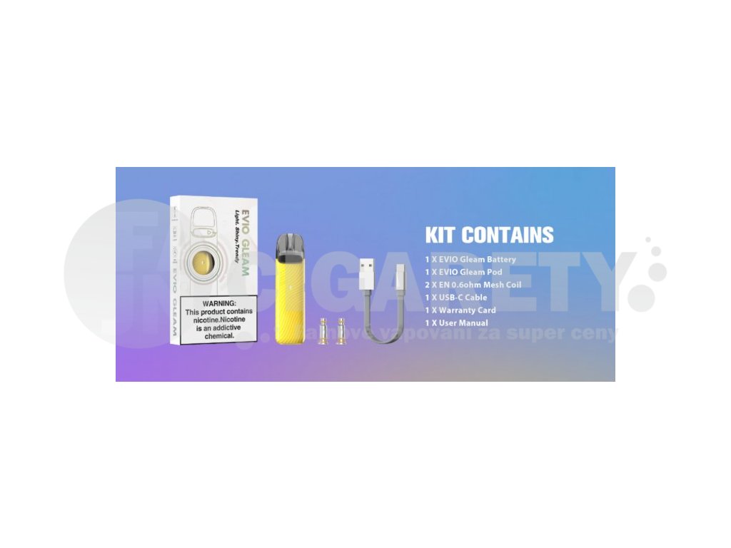 Joyetech EVIO Gleam je elegantní elektronická cigareta s hladkým povrchem a křišťálově čistým vzhledem. Integrovaný monočlánek o kapacitě 900mAh disponuje LED indikátorem stavu nabití, automatickým výkonem až 20W a USB-C portem pro rychlé nabíjení. Cartridge (POD) s vyměnitelným atomizerem řady EN nabízí pohodlné vrchní plněním o objemu až 2ml. Výrobce si připravil pro tuto e-cigaretu novou Mesh spirálku o odporu 0,6ohm