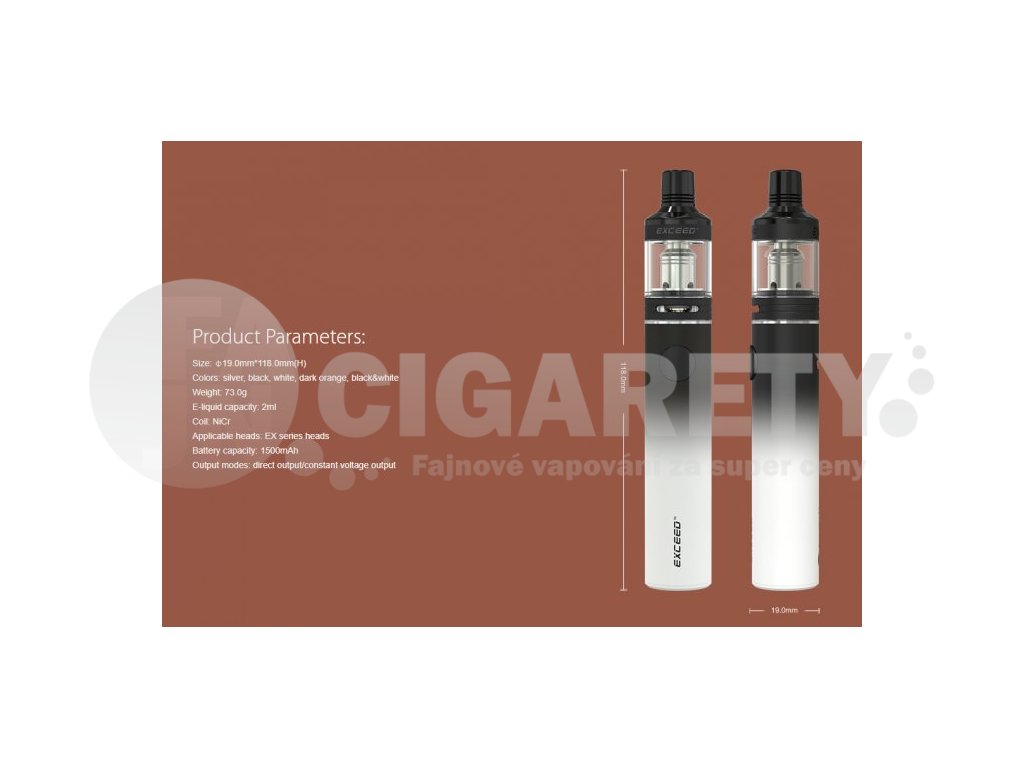Elektronická cigareta Exceed D19 přináší pohodlné vapování s režimy konstantního a výstupního napětí. Tradiční tvar baterie představuje novinku v podobě horního LED indikátoru stavu nabití baterie (viz foto). Clearomizer Exceed o průměru 19mm spolupracuje s atomizery řady EX, které přinášejí dokonalou souhru autentické chuti liquidu a velké kouřivosti. Využívá systém horního plnění - po odšroubování vrchní části plníte liquid přímo do těla clearomizeru o objemu 2ml. Žhavicí hlavy EX nabízí dva odpory 0.5Ω (přímé potahování) a 1.2Ω pro ústa-plíce. Celý clearomizer je plně rozebíratelný = snadná údržba. Regulace přívodu vzduchu pro nastavení optimální kouřivosti se nachází ve spodní části.