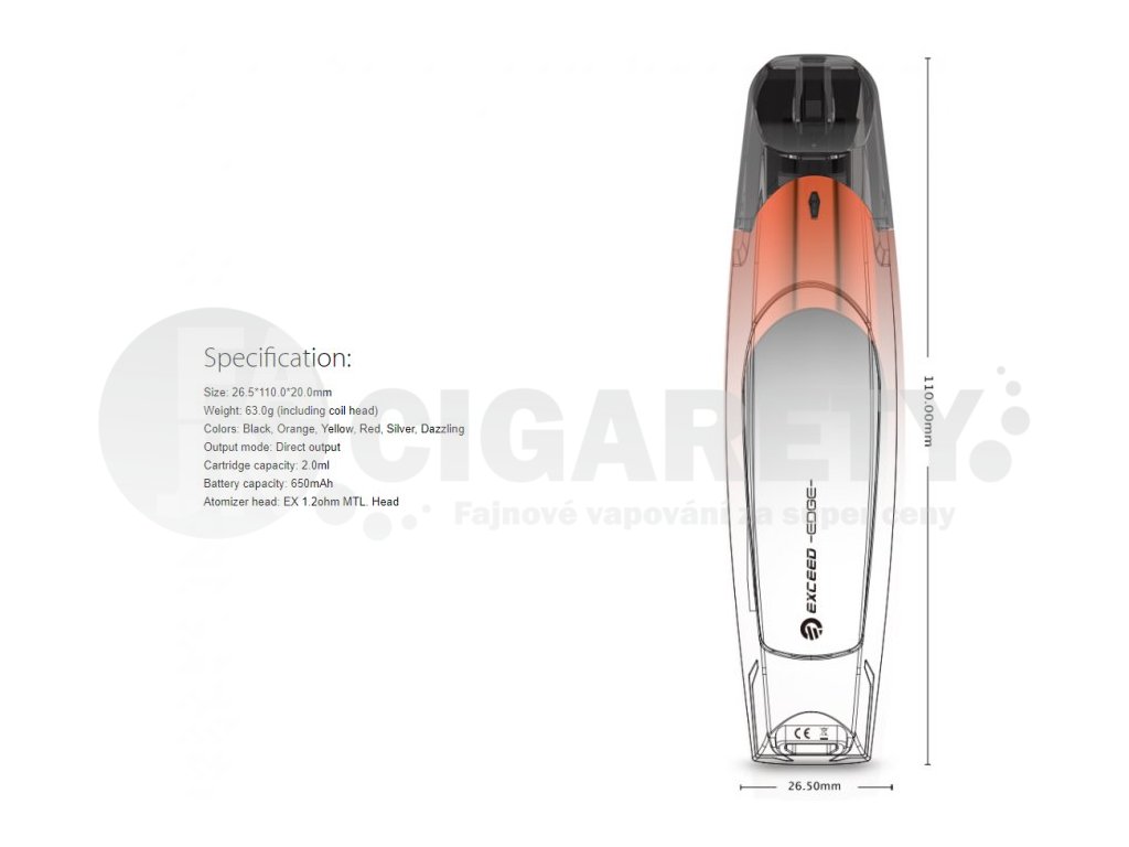 Nový přírůstek modelu Exceed se nechal inspiroval designem sportovních aut. Exceed Edge se řadí mezi menší přístroje pro vaping, avšak přináší vestavěnou baterii o kapacitě 650mAh, která při instalaci atomizeru 1,2ohm drží standardní MTL vapování. Tato baterie je vybavena i indikátorem stavu nabití a pohodlným bočním spínacím tlačítkem. Jednoduché doplňování liquidu přímo do cartridge o objemu 2ml.