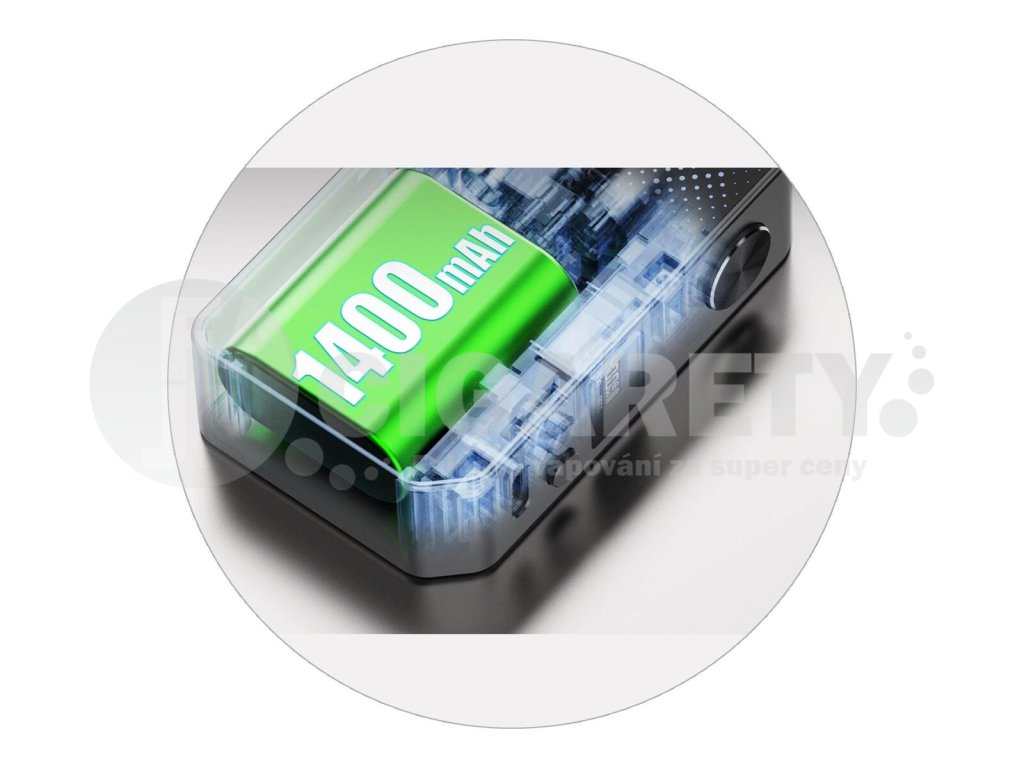 Tělo zařízení disponuje obrovskou integrovanou baterií o kapacitě 1400mAh, ta zajišťuje dlouhou výdrž a možnost intenzivního potahování po mnoho hodin bez nutnosti častého opětovného dobíjení. Pro potřeby nabíjení najdete v přední části moderní rozhraní USB-C s podporou nabíjení proudem až 1.4A.