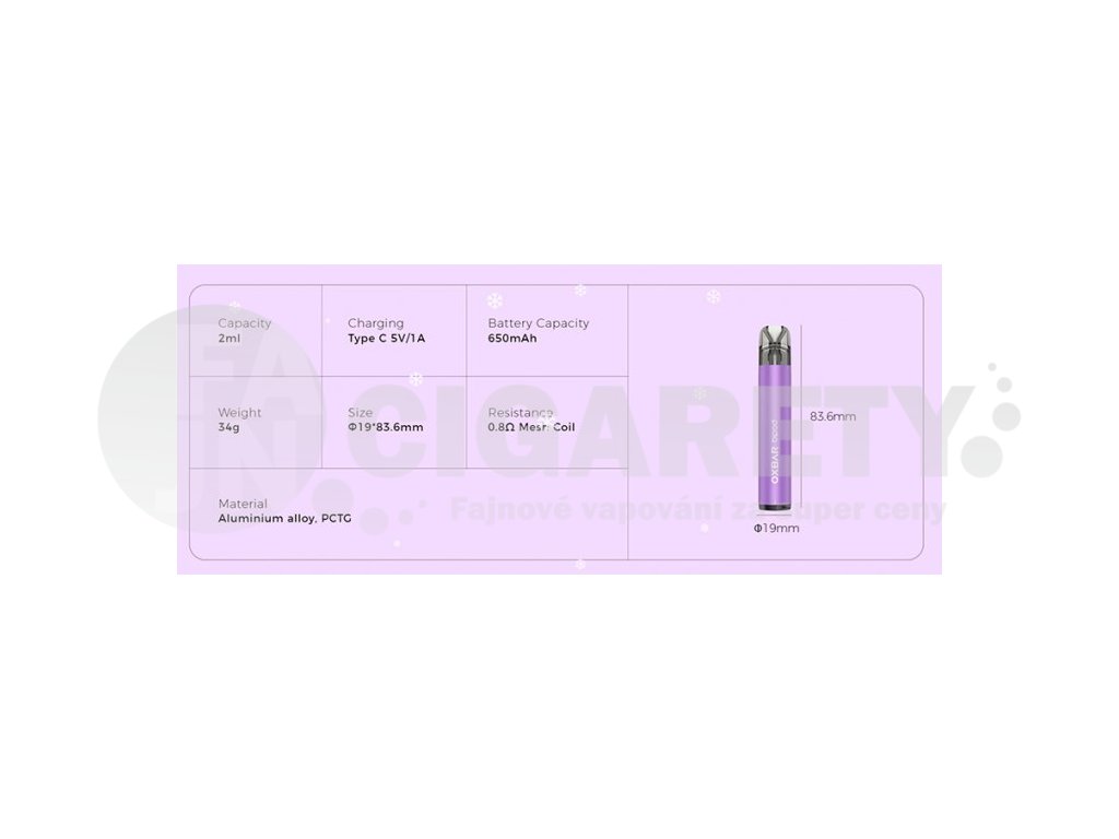 OXBAR Bipod je elegantní elektronická cigareta s POD systémem, která byla navržena a vyrobena ve spolupráci se společností OXVA. Baterie je napájena monočlánkem o kapacitě 650mAh s rychlonabíjením typu USB-C 5V/1A, který Vám zajistí dlouhý vaping po celý den. Vyměnitelná cartridge (POD) z PCTG materiálu je vybavena žhavící hlavou Meshed o odporu 0,8ohm a pojme až 2ml liquidu. Díky magnetickému propojení s baterií lze cartridge jednoduše vyjmout a doplnit oblíbeným liquidem.