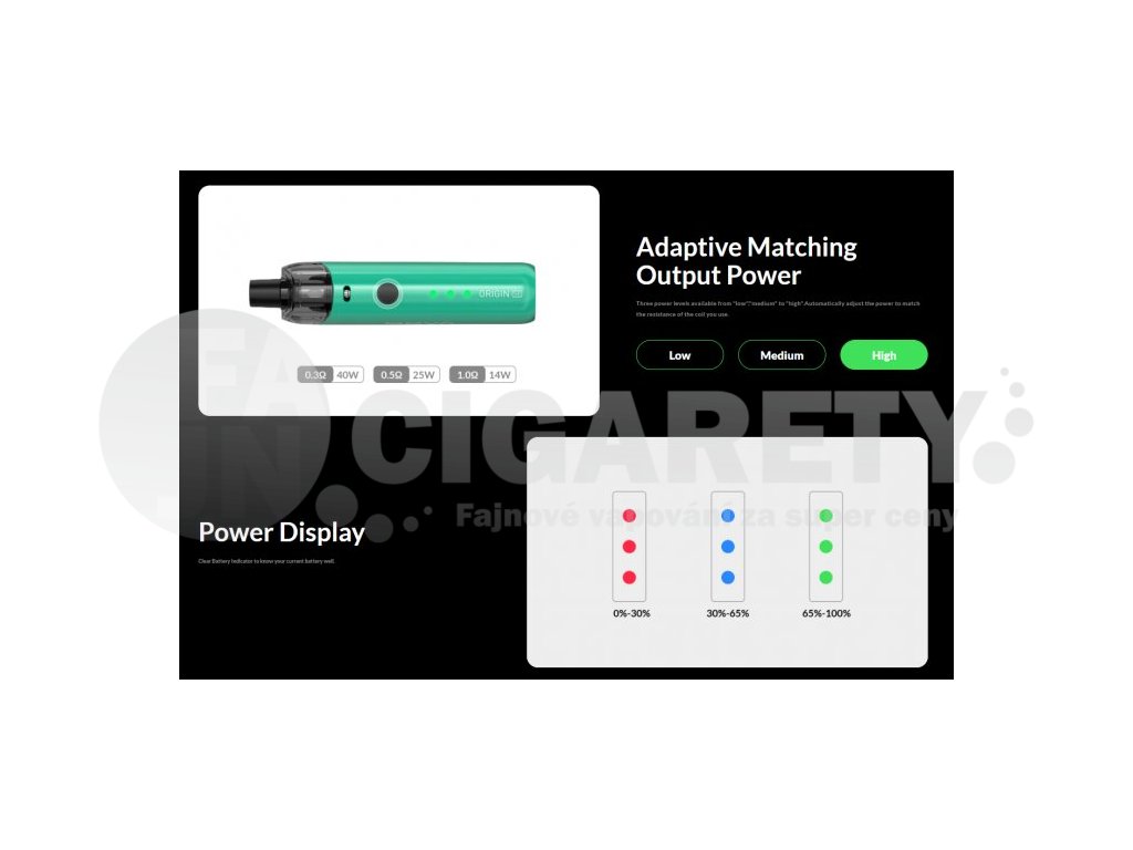 Není určeno pro náplně obsahující nikotin! OXVA Origin SE je odlehčený grip s inteligentním čipem, který automaticky nastaví výstupní výkon (nízký, střední a vysoký) na základě odporu žhavící hlavy = optimální nastavení kouřivosti a chuti liquidu. Vestavěná baterie o kapacitě 1400mAh disponuje LED indikátorem stavu nabití, automatickým a manuálním spínačem a rychlým USB-C portem pro rychlé nabití. V základním balení budete mít na výběr žhavící hlavy o odporu 0,3ohm a 0,5ohm. Cartridge s pohodlným plněním pojme až 3,5ml Vašeho oblíbeného liquidu.