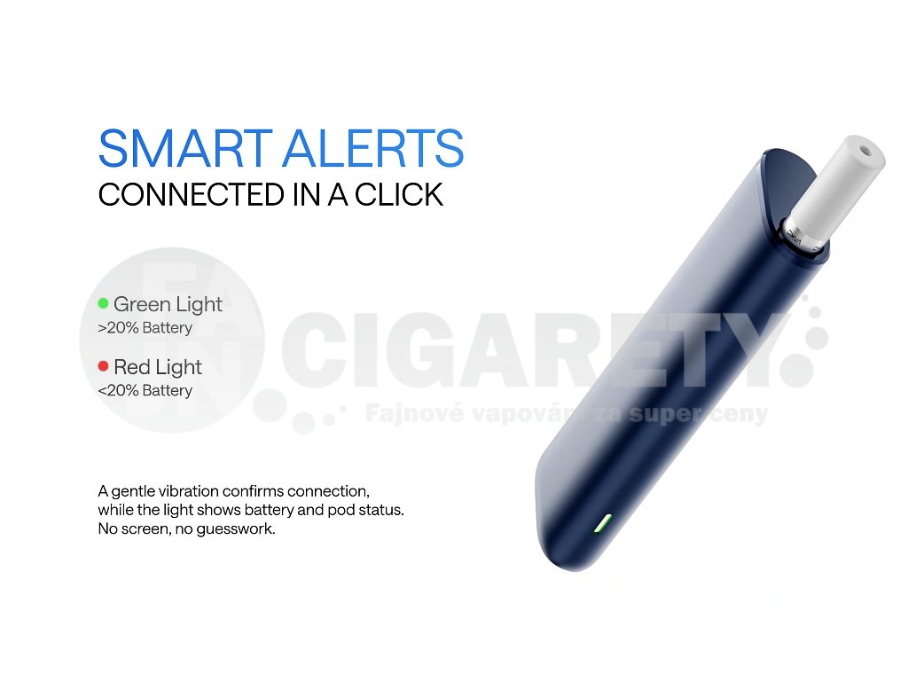 LED indikace stavuDiskrétní LED kontrolka informuje uživatele o stavu nabití baterie prostřednictvím dvou barevných signálů - zelená svítí při kapacitě nad 20%, červená pod 20%. Systém doplňuje jemná vibrace při úspěšném připojení cartridge, která potvrzuje správné usazení a připravenost zařízení k vapování bez nutnosti jakékoliv obrazovky. |