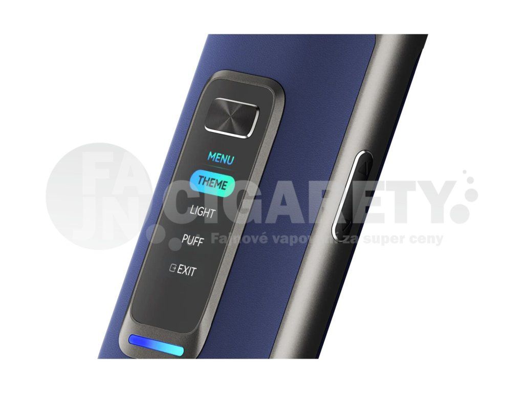 Přední panel zdobí mohutný celobarevný displej, který vás bude během používání neustále informovat o všech parametrech a aktuálním stavu baterie. Všechny položky jsou krásně čitelné a jedním pohledem si vždy snadno ověříte, jaký máte nastavený výkon, jaký je odpor cartridge, kolik máte odvapováno potahů nebo zda není e-cigareta uzamčená. Vše potom doplní krásné barevné animace zobrazené na displeji během potahu pro vizuální požitek při vapování.