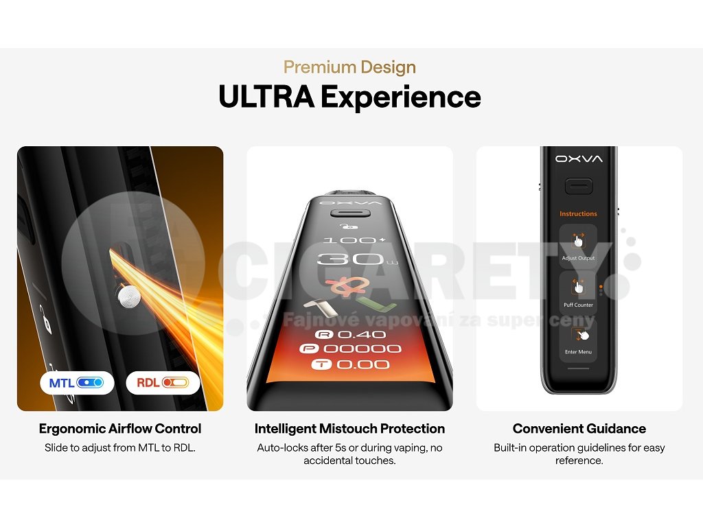 Prémiový designOXVA XLIM 3 Ultra disponuje robustní konstrukcí z vysoce kvalitní zinkové slitiny v kombinaci s odolným PCTG plastem pro pody. Moderní hranatý design s uhlazenými rohy zajišťuje pohodlné držení a prémiový pocit v ruce. Zařízení je dostupné v osmi atraktivních barevných variantách včetně efektní Ultra Carbon s karbonovým vzhledem a zlatými závodními pruhy. |