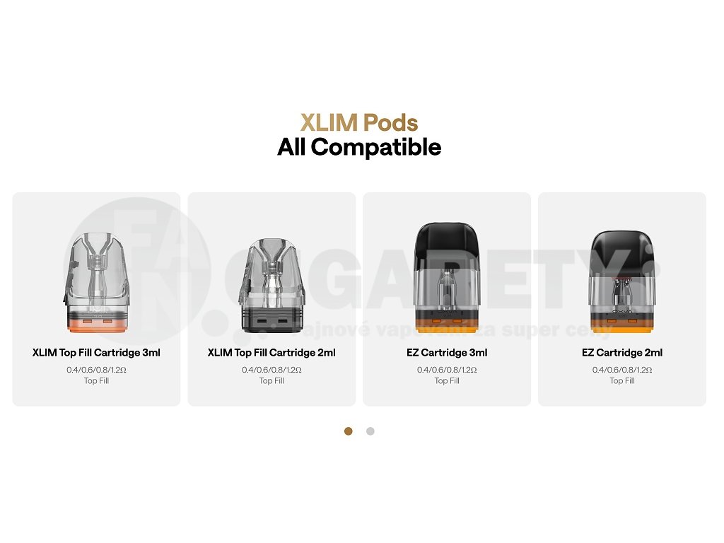 Špičkové Pod CartridgeXLIM V3 top-fill pody s kapacitou 3 ml (TPD verze 2 ml) nabízejí pohodlné boční plnění pomocí bezpečného silikonového uzávěru bez rizika vytečení. Pody jsou vyrobeny z odolného PCTG materiálu s průhledným designem pro snadnou kontrolu hladiny liquidu. Plná kompatibilita s celou řadou XLIM podů včetně V2, V3 a EZ Cartridge variant. |