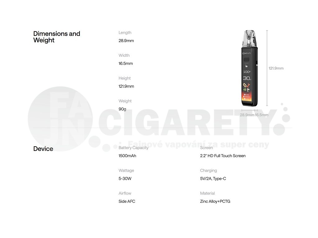 Parametry a specifikaceRozměry: 121,9 x 28,9 x 16,5 mm Kapacita baterie: 1500 mAh (integrovaná) Režimy: Smart VW, Eko režim, Super Pulse System Metody spínání potahu: Auto-draw (senzorové) + tlačítkové ovládání Výstupní napětí: 3,0-4,2V (automaticky řízeno čipsetem) Výstupní výkon: 5-30W (nastavitelný) Podporovaný odpor: 0,3-3,0Ω Způsob nabíjení: USB-C, 5V/2A (rychlonabíjení) Regulace výkonu: automatická + manuální Objem Pod Cartridge: 3 ml (TPD verze 2 ml) Styl potahování: MTL (mouth-to-lung) / RDL (restricted direct-lung) Odpor žhavících hlav v balení: 0,6Ω / 0,8Ω (XLIM V3) Regulace přívodu vzduchu (Airflow): Boční, plynule nastavitelný Hmotnost: 90g Barva: Metal Grey, Metal Silver, Cherry Pink, Mint Green, Ultra Carbon, Mocha Brown, Midnight Black, Bordeaux Red Materiál: Zinkové slitina + PCTG |