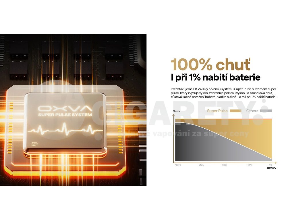 Špičkový výkonSuper Pulse System čipset zajišťuje stabilní výstupní výkon od 5 do 30 wattů napříč celým rozsahem nabití baterie. Pokročilá pulzní technologie udržuje konstantní intenzitu chuti i při 1% zbývající kapacity, čímž eliminuje slabé potahy typické pro klasické zařízení. Chipset inteligentně vyrovnává produkci páry a chuti pro optimální zážitek. |