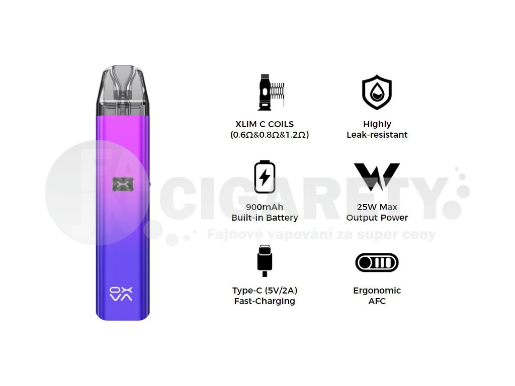 OXVA představuje elektronickou cigaretu Xlim C, která tuto oblíbenou řadu Pod systémů posouvá o další level výš. Příjemný ergonomický tvar baterie v 10-ti barevných zpracování nabízí integrovaný monočlánek o kapacitě 900mAh s rychlým USB-C nabíjením (80% za pouhých 30 minut). Spínací tlačítko je vybaveno LED indikátorem stavu nabití. Xlim C disponuje Photonovým čipem, který automaticky upraví výkon dle odporu žhavící hlavy. Na boční straně baterie je umístěno regulační tlačítko pro přívod vzduchu, díky kterému si jednoduše nastavíte RDL nebo MTL režim vapování. V obsahu balení nalezneme prázdnou cartridge o objemu 2ml s vyměnitelnými žhavícími hlavami o odporu 0,6ohm a 0,8ohm, avšak je plně kompatibilní s cartridgemi Xlim V2.