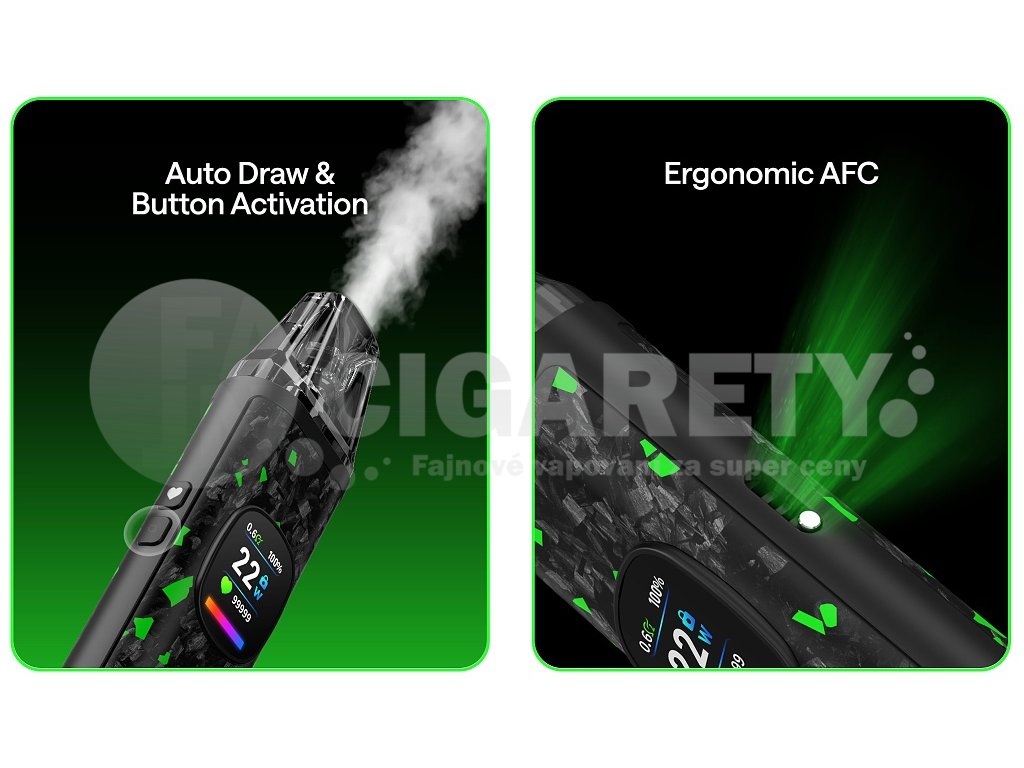 Parametry a specifikaceRozměry: 114.5 x 25 x 15 mm Kapacita baterie: 1300 mAh Režimy: Automatická regulace s možností personalizace Metody spínání potahu: Automatické a manuální Výstupní napětí: 3.2 - 4.2 V Výstupní výkon: 5 - 30 W Podporovaný odpor: 0.2 - 3.0 Ω Způsob nabíjení: USB-C port (5V / 2A) Regulace výkonu: Ano Objem Pod Cartridge: 2 ml Styl potahování: MTL / RDL Odpor žhavících hlav v balení: 0.6 Ω / 0.8 Ω Regulace přívodu vzduchu (Airflow): Ano, boční Hmotnost: 67 g Barva: Carbon Fiber (Abstraktní zelená) Materiál: Zinková slitina + karbon/IML + PCTG |