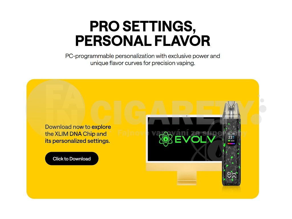 OXVA Xlim Pro 2 DNA Pod Kit představuje revoluční spojení špičkové technologie Evolv DNA čipsetu s oceněným designem kompaktní elektronické cigarety, což z ní činí první pod systém na světě s pokročilým DNA čipem. Tato prémiová elektronická cigareta nabízí precizní teplotní kontrolu a funkci Replay pro přesnou reprodukci chuti při každém potahu, zatímco HD barevný displej s vysokou jemností pixelů poskytuje kompletní přehled o všech parametrech vapování. S integrovanou baterií 1300 mAh a rychlým USB-C nabíjením 5V/2A zajišťuje dlouhodobý a spolehlivý provoz, který kombinuje výkon 5-30W s podporou odporu 0.2-3.0Ω pro maximální variabilitu. Model podporuje jak automatické, tak manuální spínání potahu a nabízí dvě metody ovládání podle preferencí uživatele. Vynikající power management díky DNA čipsetu prodlužuje výdrž baterie oproti konvenčním pod systémům, zatímco pokročilá teplotní ochrana zabraňuje vzniku dry hitů při prázdné cartridgi. Personalizace prostřednictvím softwaru EScribe od výrobce Evolv umožňuje úpravu zařízení do nejmenších detailů a odhalení pokročilých funkcí elektronické cigarety.