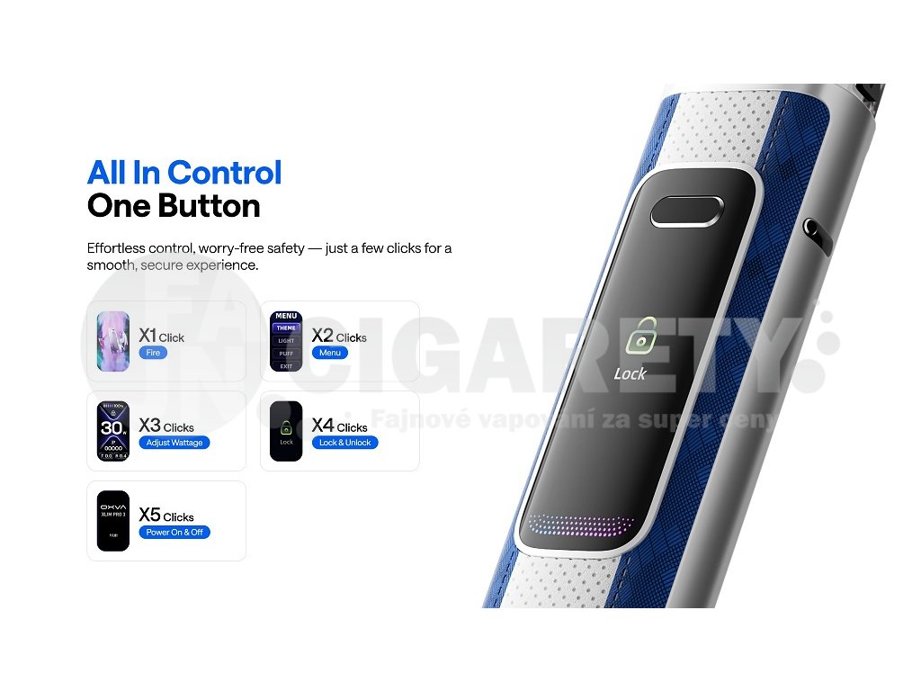 Elektronická cigareta je vybavena rychlonabíjecím portem USB-C s podporou 5V/2A, který dokáže nabít baterii na 80% kapacity za pouhých 30 minut a plné nabití trvá přibližně 45-60 minut. OXVA XLIM Pro 3 je dodávána s novými XLIM V3 top-fill Pod Cartridgemi s kapacitou 2 ml (verze TPD), s odpory 0,6Ω a 0,8Ω. Lze však dokoupit hned několik variant odporů: 0,4Ω pro volnější RDL styl, 0,6Ω a 0,8Ω pro univerzální použití mezi MTL a RDL, a 1,2Ω pro těsné MTL potahování s nikotinovými solemi. V balení tak naleznete Pod Cartridge pro okamžité vyzkoušení různých stylů vapování. Zařízení disponuje inteligentním Smart Wattage režimem, který automaticky nastaví optimální výkon podle vloženého podu a odporu, což eliminuje riziko připálení a zajišťuje perfektní chuť při každém potahu. Samozřejmostí je pak i manuální nastavení výkonu pomocí jednoho tlačítka. Nastavení je velmi jednoduché, rychlé a velice intuitivní. Horizontální regulace přívodu vzduchu (airflow) umístěná na boku vedle tlačítka umožňuje plynulé přizpůsobení tahu od velmi těsného MTL až po vzdušnější RDL podle individuálních preferencí. Elektronická cigareta Oxva XLIM Pro 3 je dostupná v devíti prémiových barevných provedeních včetně Black Leather, Brown Leather, Pro Carbon, Sky Blue, Race Red a dalších variant, které kombinují moderní estetiku se špičkovým technickým zpracováním a kvalitními materiály jako zinkovou slitinu a PCTG plast.