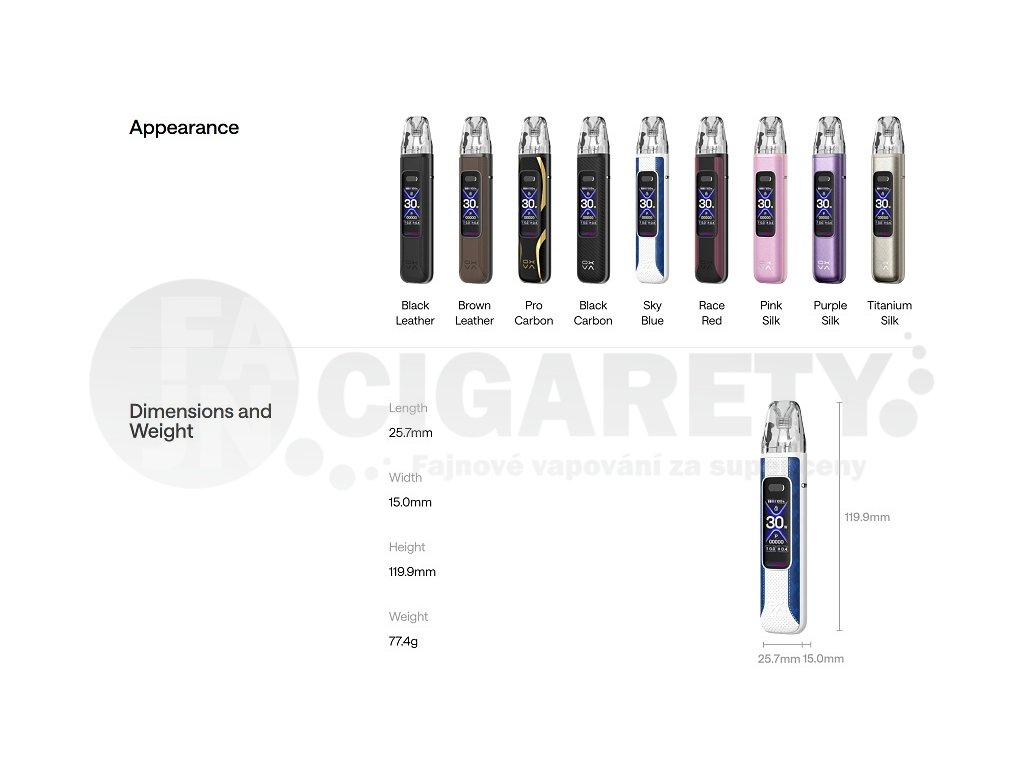 Prémiový designOXVA XLIM Pro 3 disponuje robustní konstrukcí z vysoce kvalitní zinkové slitiny v kombinaci s odolným PCTG plastem pro pody. Klasický zploštělý pero-stylový design s jemně zaoblenými rohy zajišťuje pohodlné držení a přirozený úchop v ruce. Zařízení je dostupné v devíti atraktivních variantách včetně prémiových kožených povrchů a moderních hedvábných textur. |