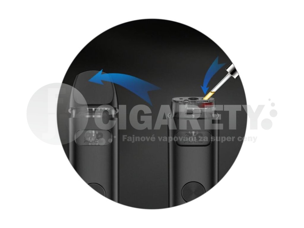 Cartridge ve vrchní části nabídne objem 2 ml. Její nespornou výhodou je potom jednoduchý mechanismus plnění. Jednoduše postačí odklopit náustek ve vrchní části a začít ihned plnit. Celý proces plnění zabere jen pár vteřin a cartridge nebudete muset během plnění ani odpojovat od těla baterie. S touto metodou si můžete e-cigaretu bez problému doplnit kdekoliv a kdykoliv.