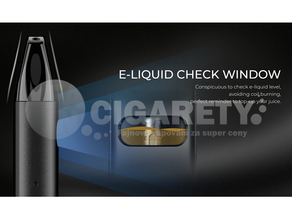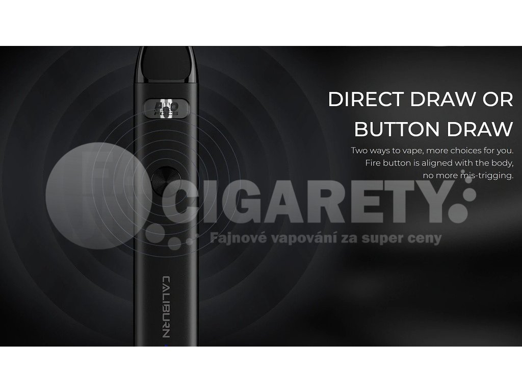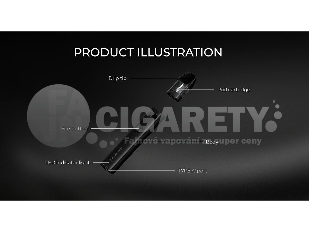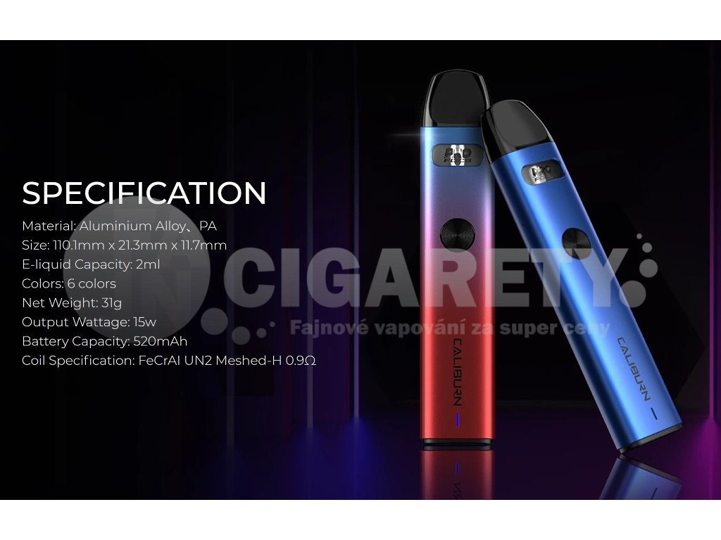 Pod elektronická cigareta vhodná pro MTL styl vapování s celkovým výkonem 15W, cartridge s objemem 2ml a Mesh žhavící hlavou s technologii kvality chuti Pro-FOCS s celkovým odporem 0,9ohm, vestavná baterie s kapacitou 520mAh, USB-C nabíjení, tělo z hliníkové slitiny, rozměry 110 x 21,3 x 11,7 mm. Možnost automatické i manuální aktivace potahu. Opakovaně plnitelná Pod Cartridge Caliburn A2.