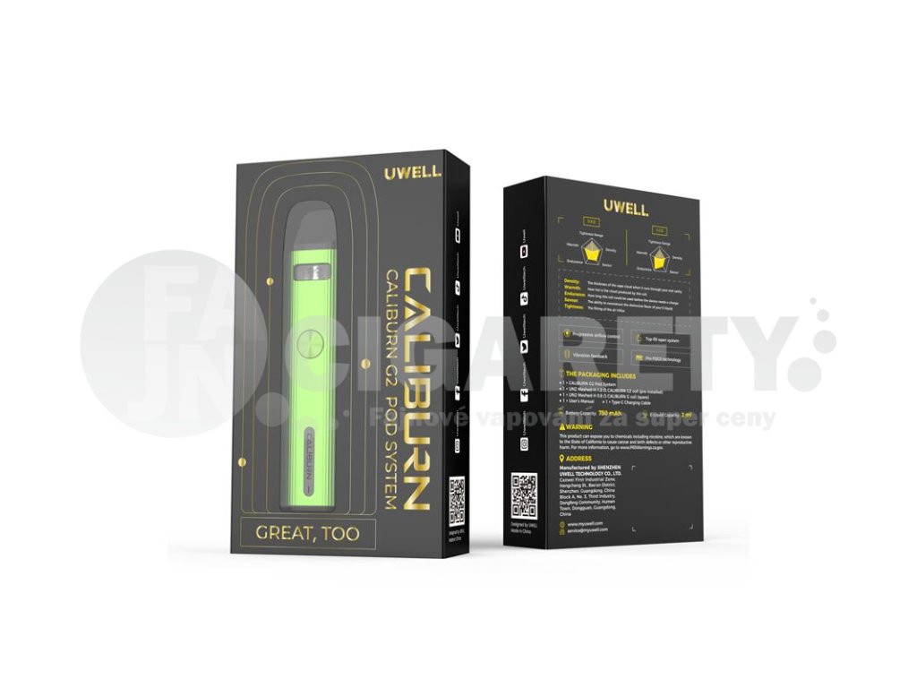 Novinkou je přítomnost unikátního bezpečnostního prvku. Zařízení disponuje haptickou vibrační odezvou, která vás v případě závady informuje mírným zavibrováním. Tato vibrace se projeví například v případě zkratu, nebo při nízkém napětí baterie, případně při překročení limitu pro jeden potah. Budete tak mít rychlý přehled o tom, co se se zařízením právě děje. Cartridge ve vrchní části je vyráběna s technologií Pro-FOCS, která klade důraz na maximálně věrné a bohaté podání chuti. Cartridge disponuje objemem 2 ml a nabídne jednoduchý systém vrchního plnění pouhým sejmutím náustku. Je kompatibilní s tělísky UN2 Meshed-H, přičemž v základním balení na vás čekají dvě tělíska s mesh pletivem a odpory 0,8 ohm a 1,2 ohm. Nabídnou skvělý výběr mezi utaženým MTL potahem a vzdušnějším MTL potahem připomínajícím RDL. Uwell Caliburn G2 Pod Kit je všestranné zařízení, jehož jednoduchost a praktičnost vás ohromí.