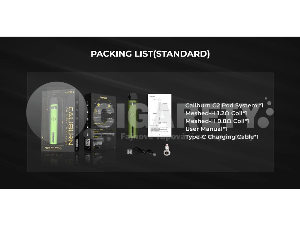 Velmi populární Pod elektronická cigareta Uwell Caliburn G se dočkala dalšího upgrade a přichází tak ve své druhé verzi, se kterou představuje nejen upravený design, ale také vylepšené parametry. V těle z hliníkové slitiny na Vás čeká integrovaná baterie s kapacitou 750mAh, která je vybavena barevnou LED pro přehlednou indikaci zbývající kapacity baterie. Pro rychlé nabíjení je na spodní straně e-cigarety připraven praktický USB-C port. Uwell Caliburn G2 nabízí jak automatický, tak i manuální systém žhavení. Vapování si tak užijete už po pouhém potahu z náustku, případně můžete i podržet tlačítko, se kterým přesně ovlivníte délku žhavení. Velkou změnou oproti předchozímu modelu je možnost nastavit si přívod vzduchu podle svých chutí a potřeb. Už není potřeba otáčet celou Pod Cartridge, samotný pod má nyní integrované kolečko, pomocí kterého nastavíte přesně takovou volnost potahu, jakou máte rádi. Rozměry 110,5mm x 22,5mm x 13mm, objem Pod Cartridge 2ml, konstanstní výkon 18W, materiál hliníková slitina, PA. Barevné provedení Carbon Black.