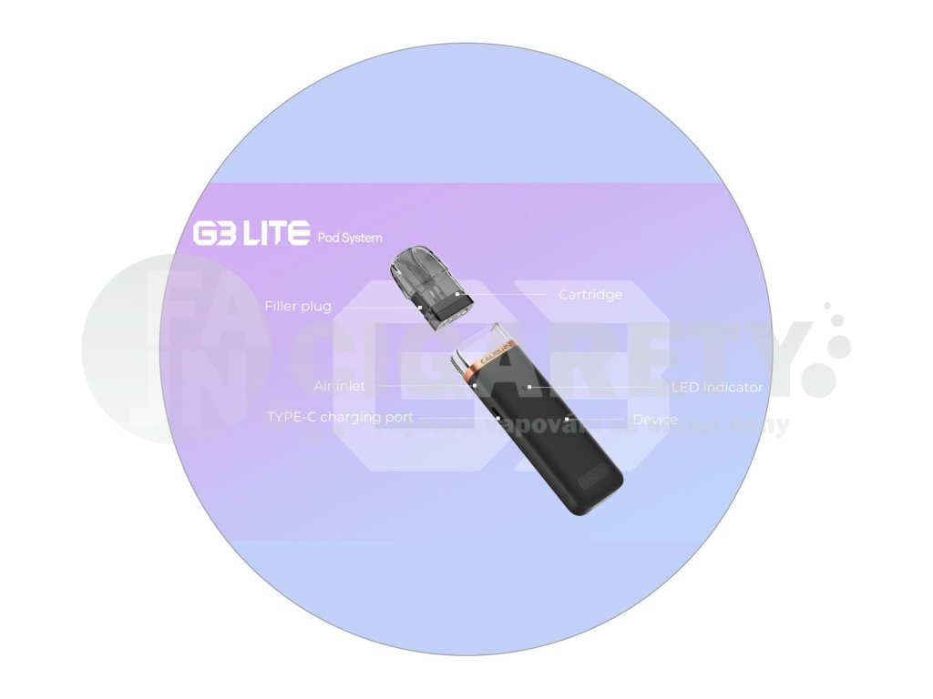 Dostupná elektronická cigareta Uwell Caliburn G3 Lite Pod Kit navazuje na zaběhnutou tradici vyladěných pod systémů Caliburn, přináší opět maximální důraz na výraznou chuť a jednoduché funkce pro snadné používání. Model G3 Lite přináší kompatibilitu s platformou cartridgí Caliburn G3, které dlouhodobě ohromují kvalitně zpracovanou konstrukcí a výrazným podáním chuti díky nejnovějším technologiím výroby. Integrovaná baterie s kapacitou 1200 mAh zajistí déletrvající požitek z vapingu s minimem nabíjení a funkce automatického nastavení výkonu s automatickým spínáním potahu se postarají o komfortní každodenní vaping.