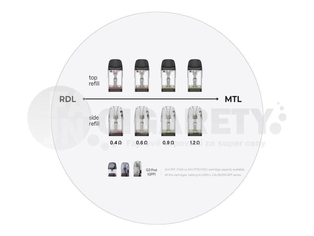 Cartridge Uwell Caliburn GPP, jež na vás čekají v tomto balení, přichází s novou metodou plnění. Boční silikonová záslepka se přemístila do horní části, pro úspěšné naplnění tak nebudete potřebovat cartridge odpojovat od těla baterie. Do plné kapacity 3ml ji snadno doplníte přímo na své e-cigaretě. Díky tomu se zkracuje doba plnění a zároveň si e-cigaretu můžete kdykoliv pohodlně doplnit jak na cestách, tak také v pohodlí domova.