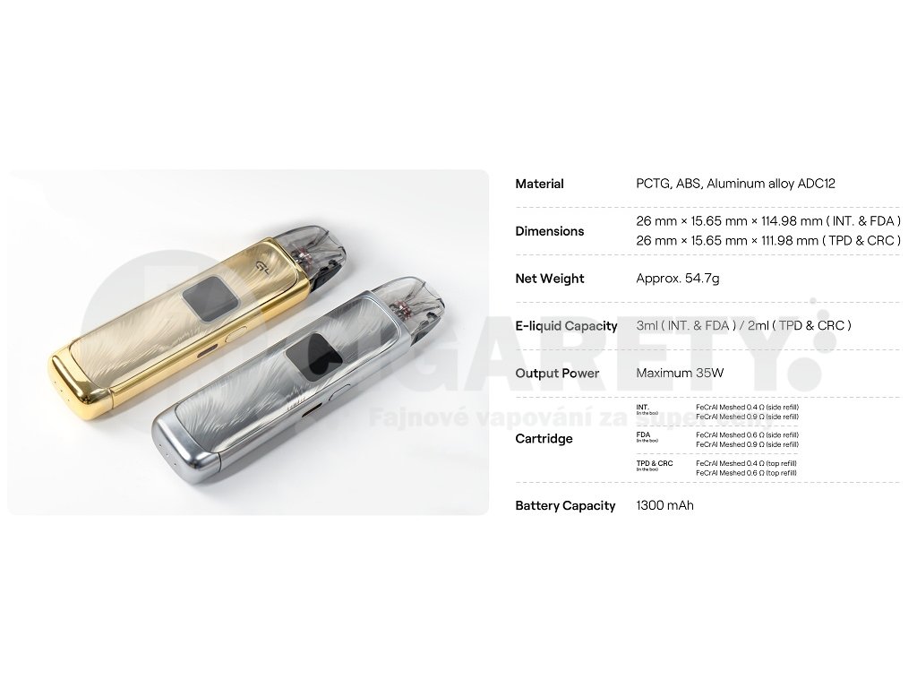 Parametry a specifikaceRozměry: 114.98 x 26 x 15.65 mm Kapacita baterie: 1300 mAh Režimy: STORM / WAVES Metody spínání potahu: automatické & manuální Výstupní výkon: 5 - 35W Způsob nabíjení: USB-C port (5V / 2A) Regulace výkonu: ano Objem Pod Cartridge: 3 ml Styl potahování: MTL / RDL Odpor žhavících hlav v balení: 0.4 Ω / 0.9 Ω Regulace přívodu vzduchu (Airflow): ano Hmotnost: 54.7 g Barva: Sahara Gold (Zlatá) Materiál: hliníková slitina (ADC12) + ABS + PCTG |
