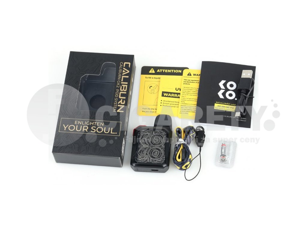 Caliburn GK2 je vylepšenou verzí řady KOKO Prime s futuristickými prvky - interakce světla a vibrace poskytuje nový způsob komunikace s uživateli. Podsvícený boční panel svítí různými barvami při různých úrovních výkonu a vibruje v různých stavech, jako je nízké napětí nebo při nutnosti výměny cartridge. Moderní USB-C port zajistí rychlé nabití. Cartridge G2 o objemu 2ml disponuje inovativní regulací přívodu vzduchu pomocí regulačního kolečka - nejlepší nastavení chuti liquidu. Žhavicí hlavy jsou kompatibilní s řadou Caliburn G.